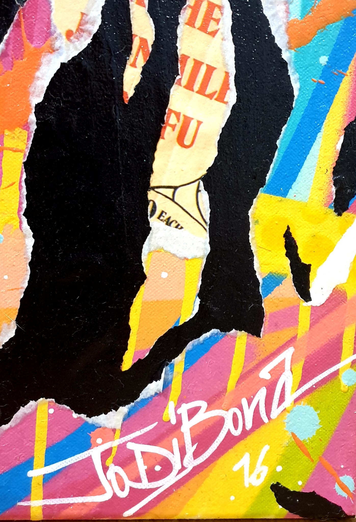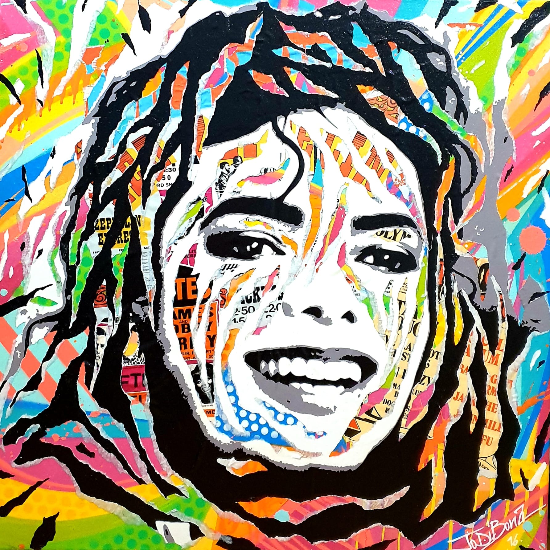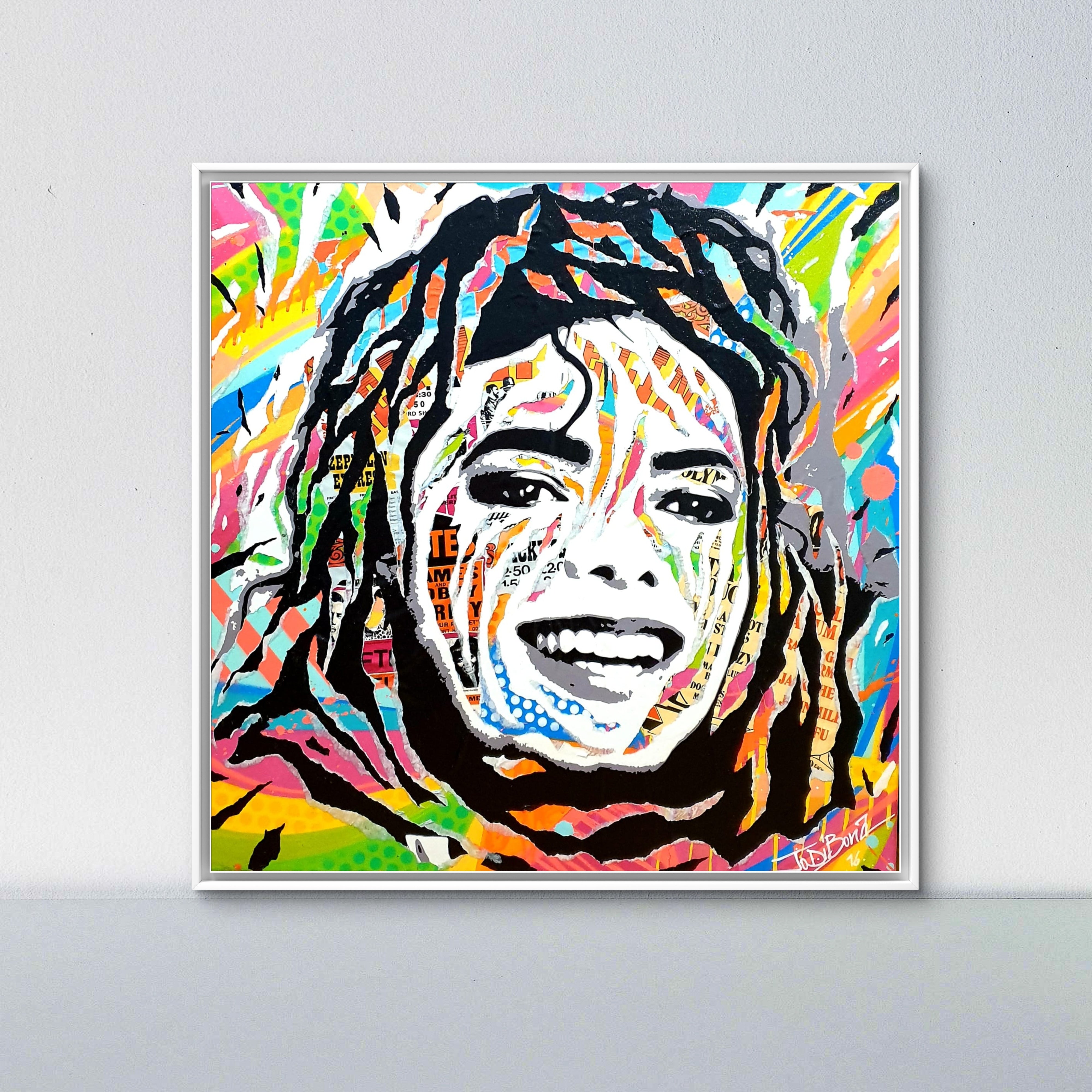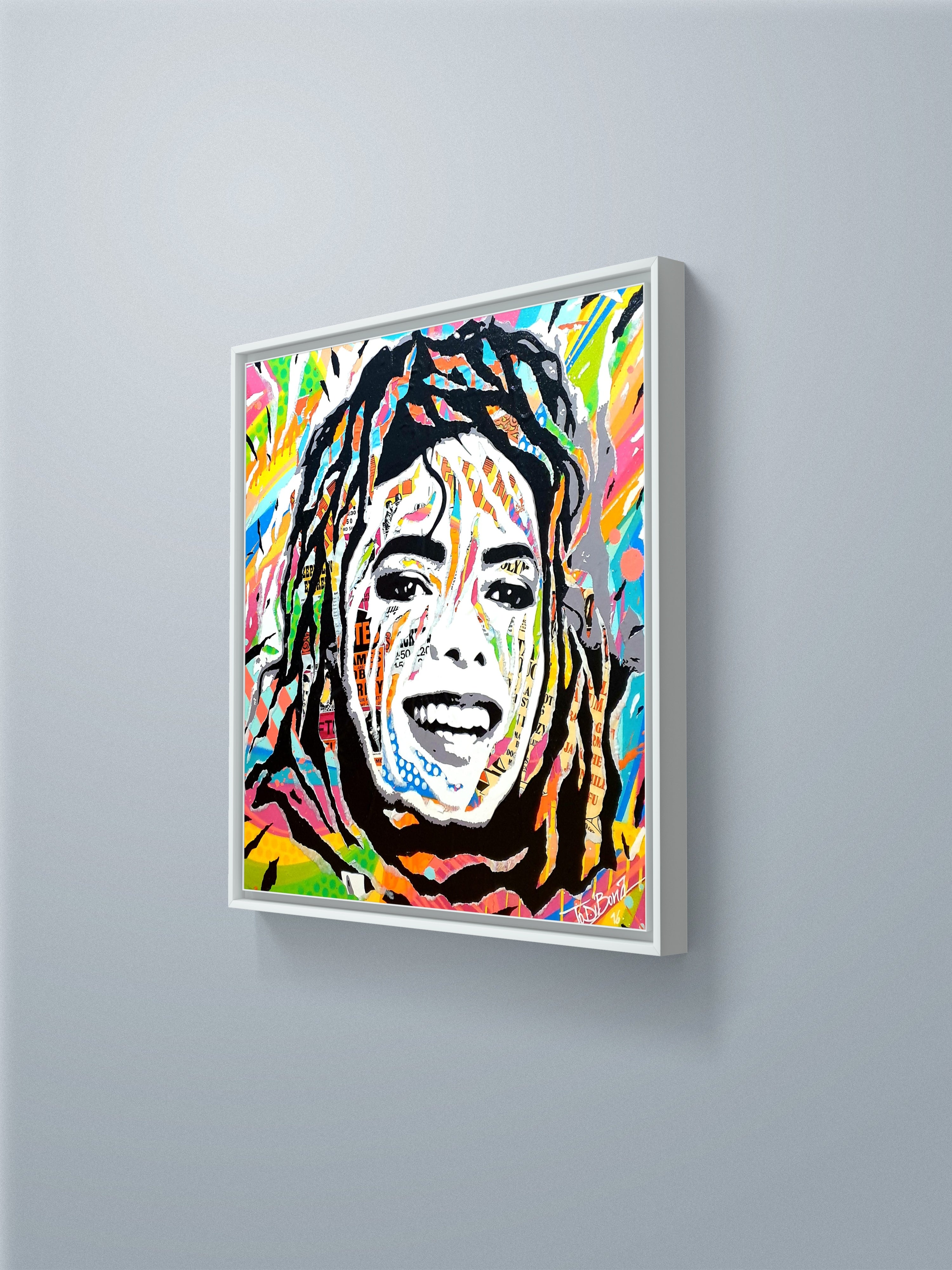 Jo Di Bona 's King Of Pop is a vibrant and iconic tribute to Michael Jackson, a universal figure in music and popular culture. Through her characteristic visual language blending collage, painting, and vibrant colors, the artist reinterprets the singer's face as a contemporary icon, both intimate and collective.