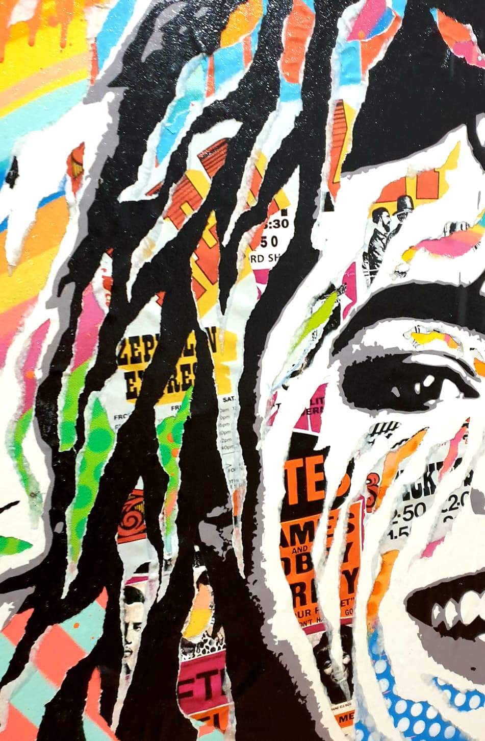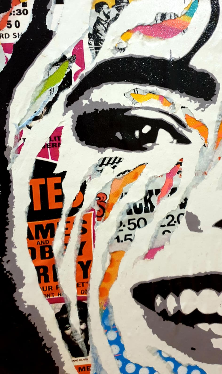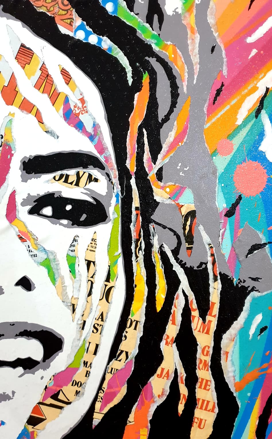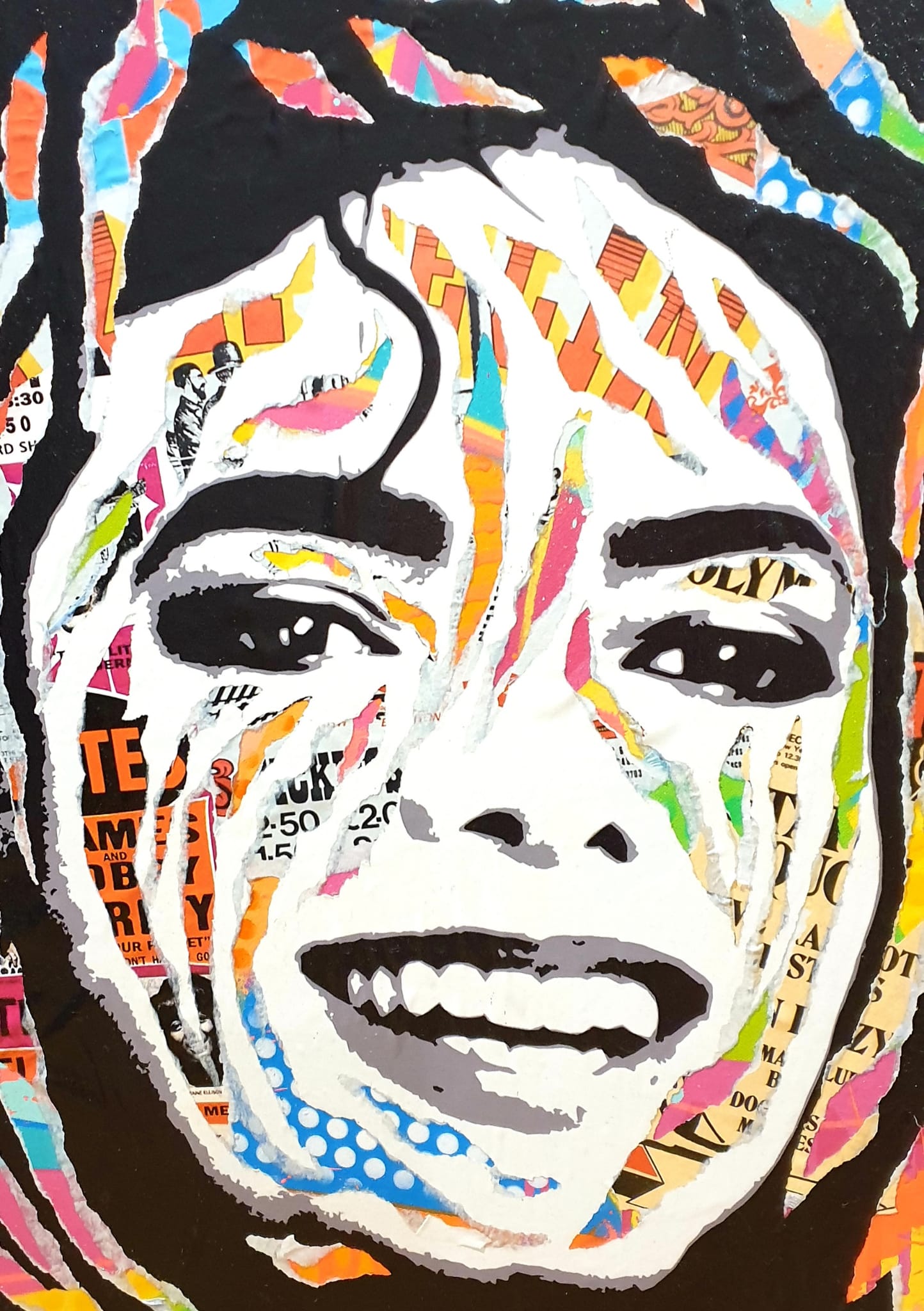 The portrait, structured by strong black and white contrasts, is enlivened by a profusion of colorful fragments taken from posters, typography, and graphic motifs. These elements, partially visible beneath the flat areas of paint, evoke the media construction of the star, their omnipresence in the collective imagination, and the multiplicity of narratives surrounding them.