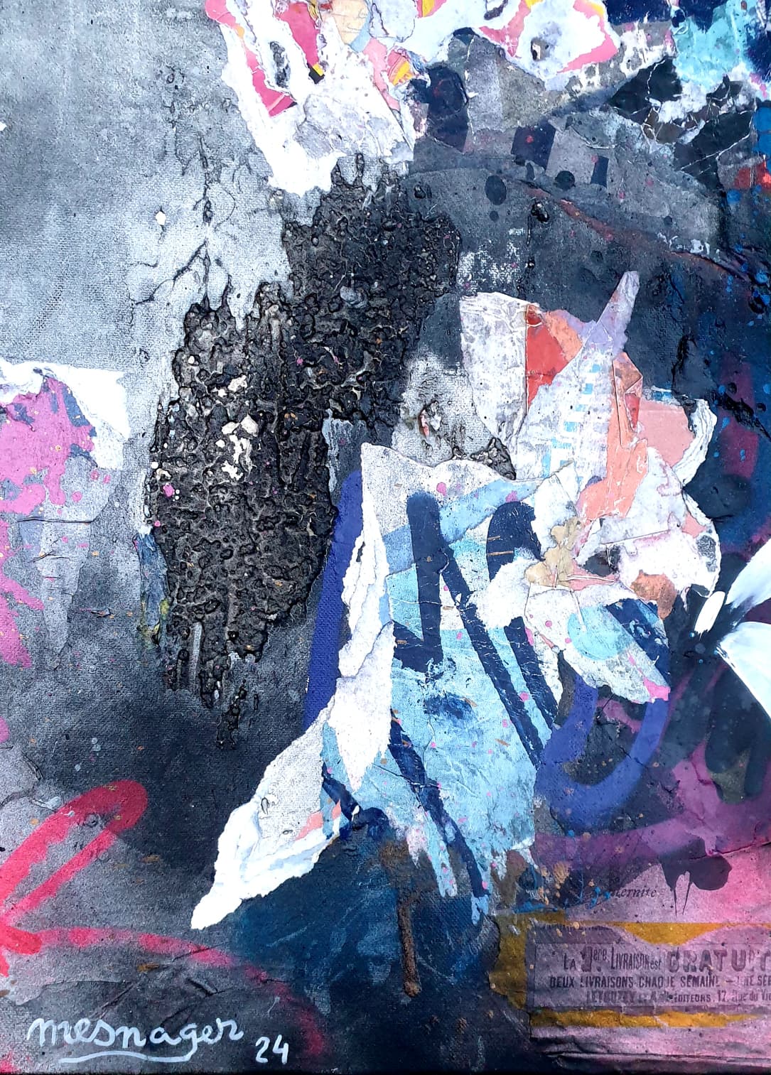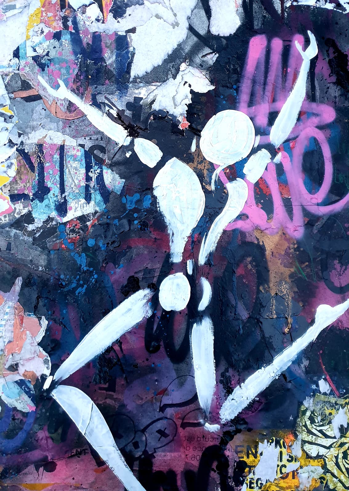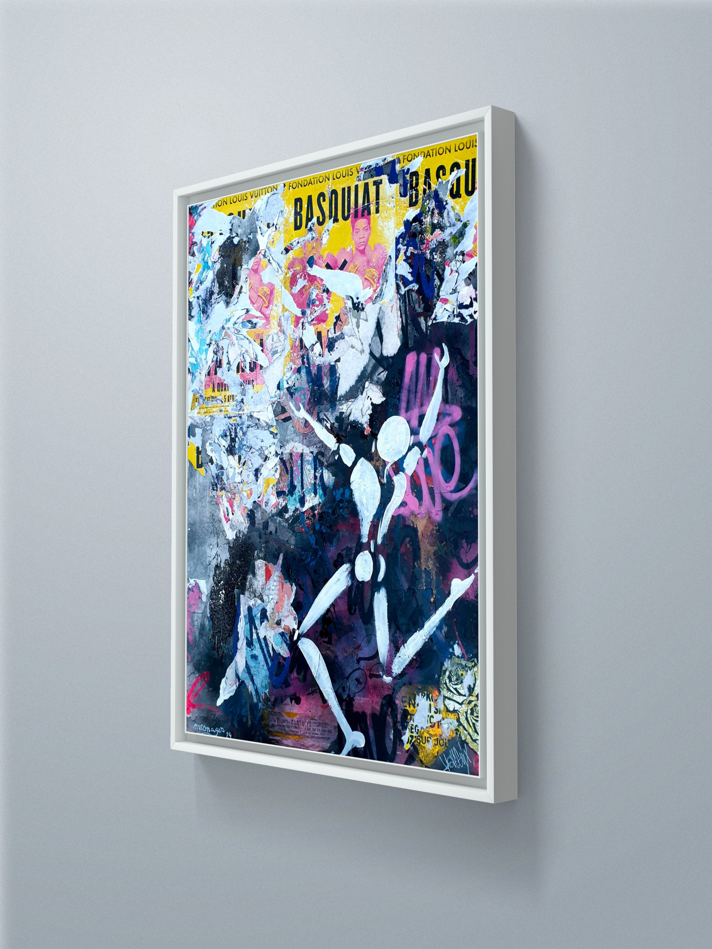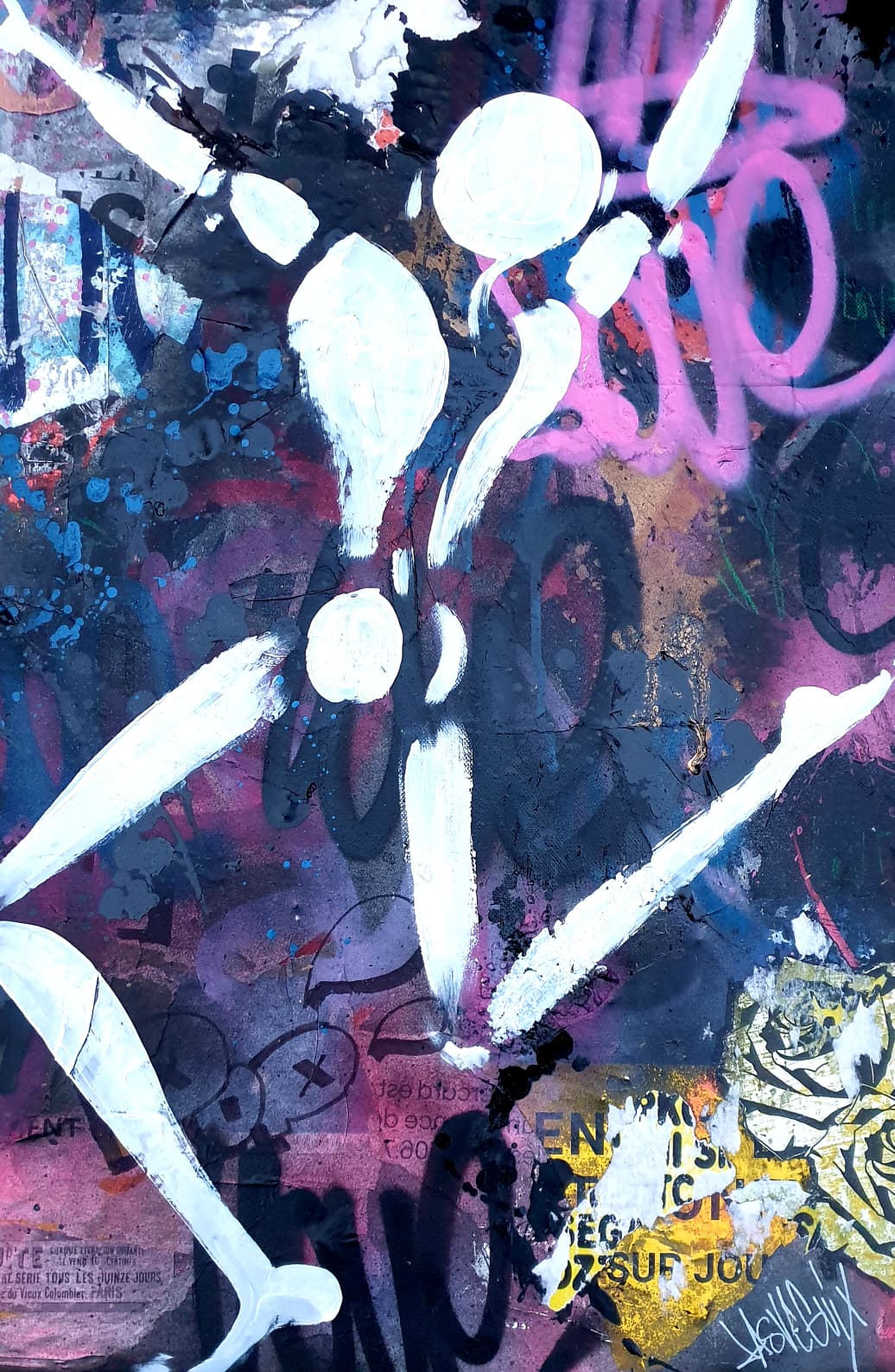 At the heart of the artwork appears the famous white body of Jérôme Mesnager, an emblematic figure of street art, captured in an upward and expressive movement. This luminous figure contrasts with the visual violence of the background and embodies a form of momentum, resistance, and freedom, like a human presence seeking to emerge from the urban tumult.