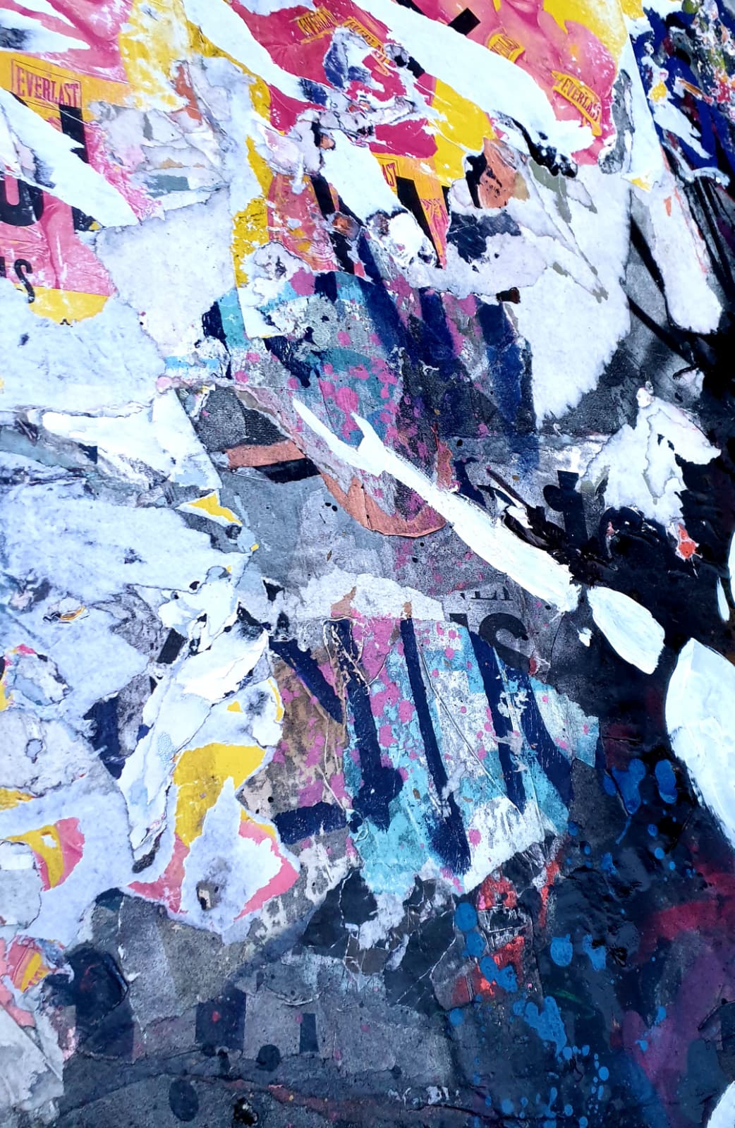 The composition evokes a city wall marked by time, torn posters, and successive layers of visual interventions. Fragments of posters in shades of yellow, pink, and black, partially ripped, interact with dark areas, tags, and bursts of color, creating a dense, vibrant, and chaotic surface, true to the raw energy of the street.