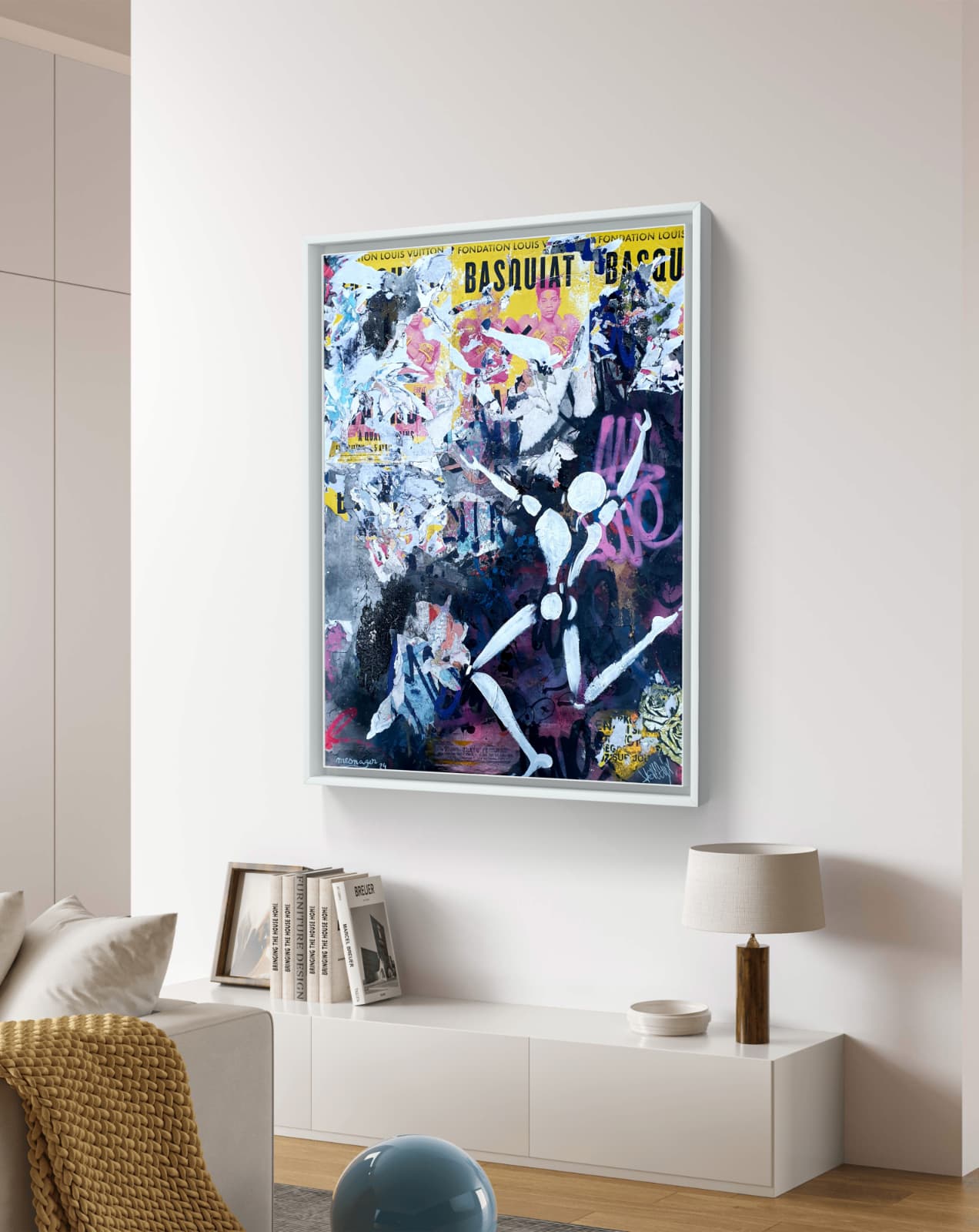 Lasveguix's intervention reinforces the graphic and textural dimension of the whole, through a process of collage, tearing, and layering that echoes Basquiat's radical aesthetic: an instinctive, political, and profoundly vibrant style of painting. The work thus plays on the collective memory of street art, somewhere between homage, reinterpretation, and contemporary reappropriation.
