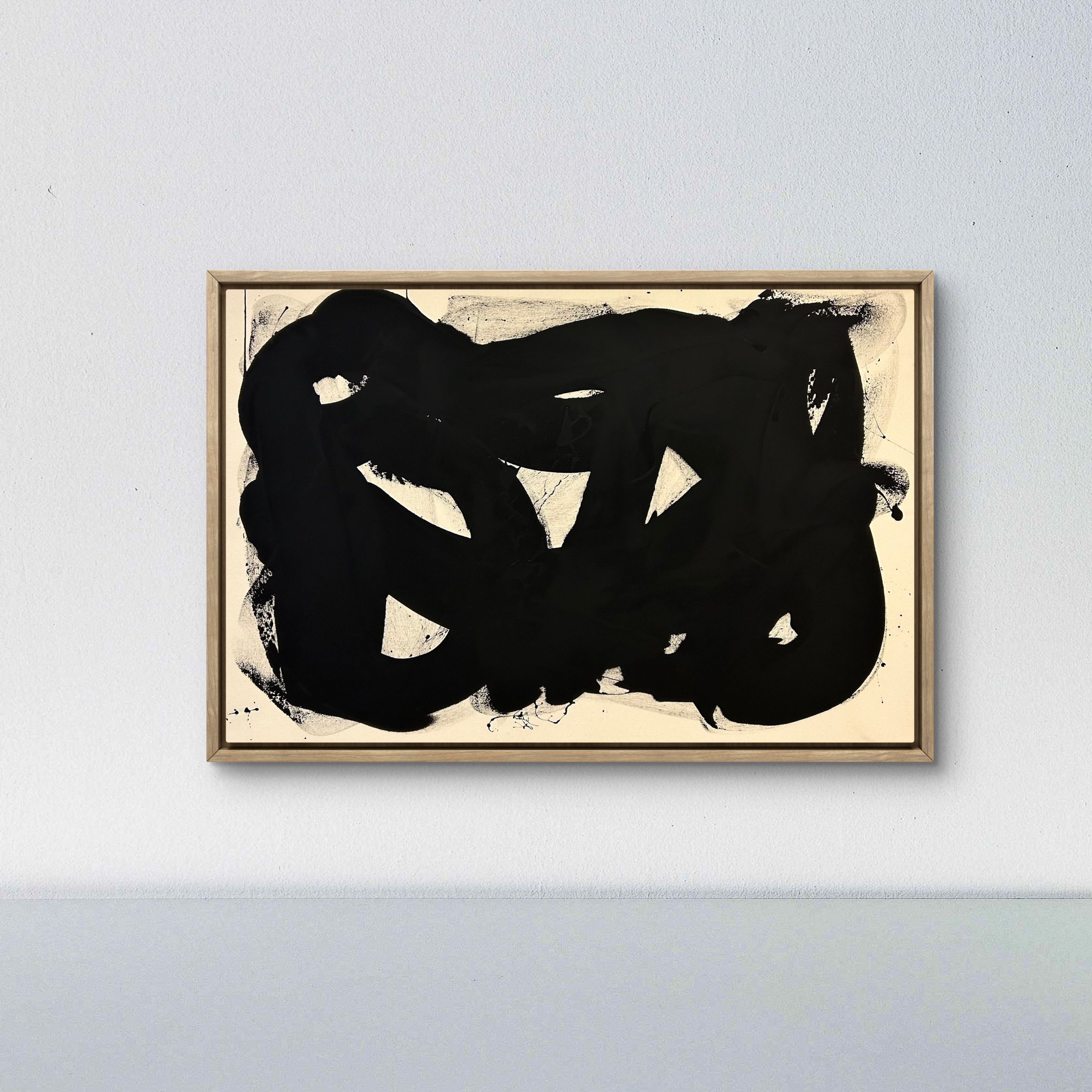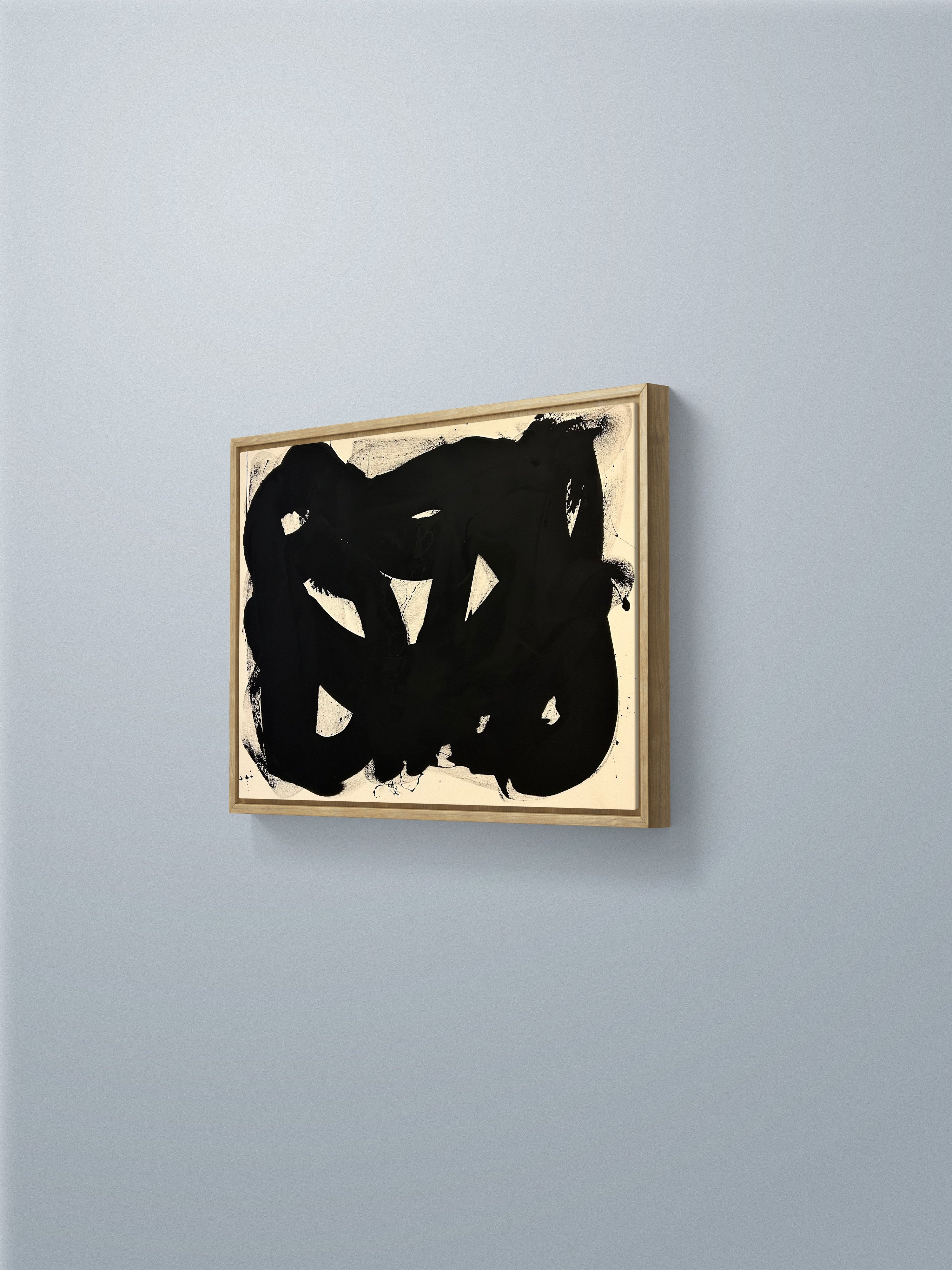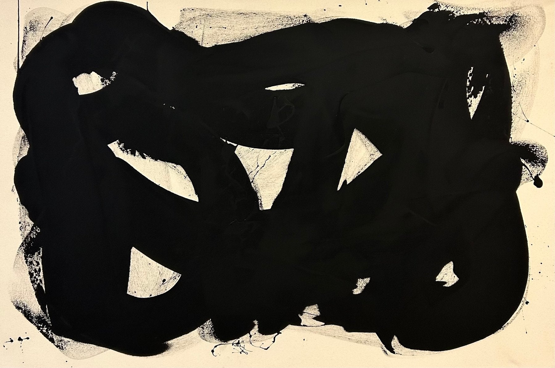 Les contours irréguliers et les ouvertures blanches au cœur de la composition suggèrent un mouvement organique, presque calligraphique, où le noir se déploie comme une énergie brute. Les éclaboussures et traces périphériques rappellent l’instantanéité de l’acte créatif, où la spontanéité du geste s’impose sur toute recherche de perfection formelle.