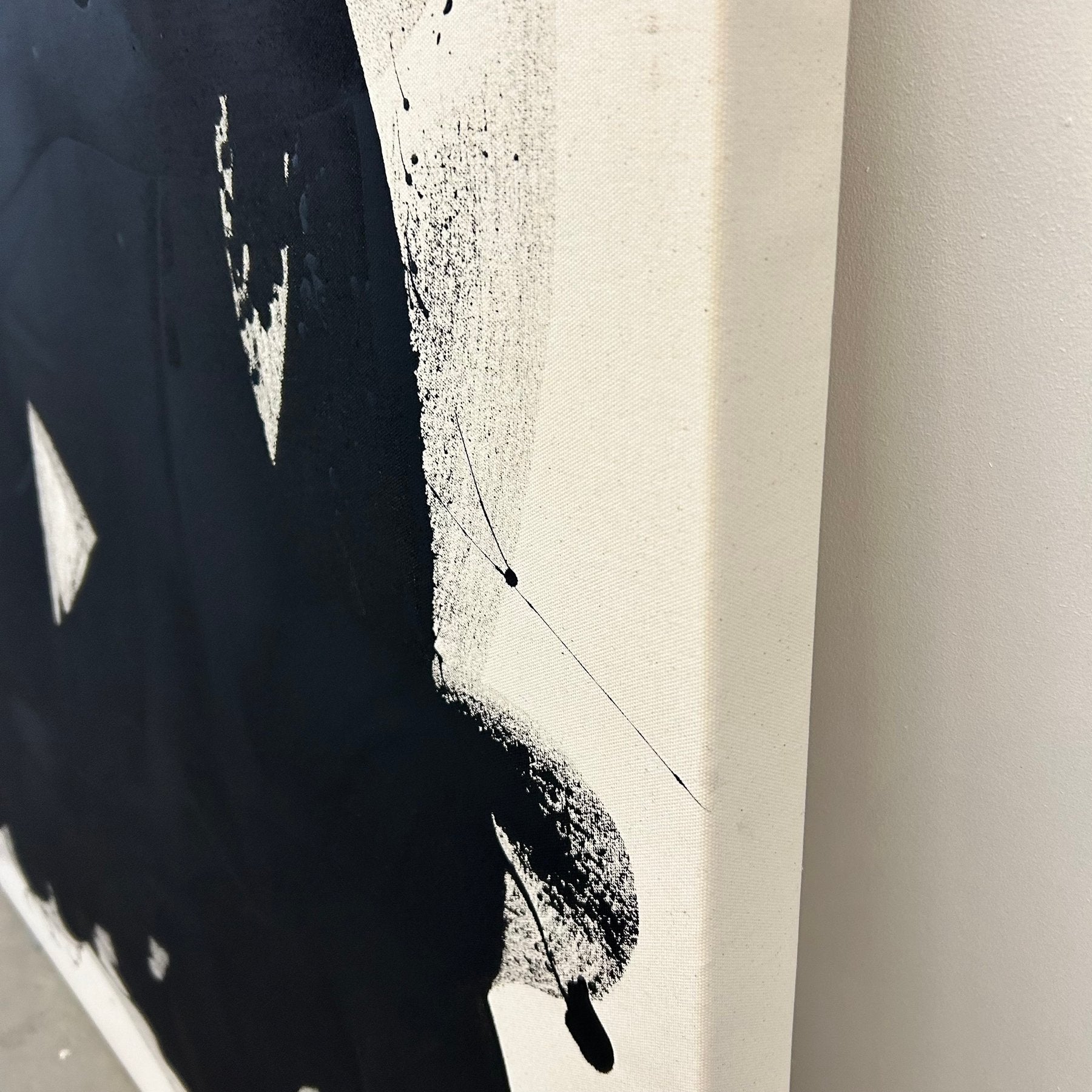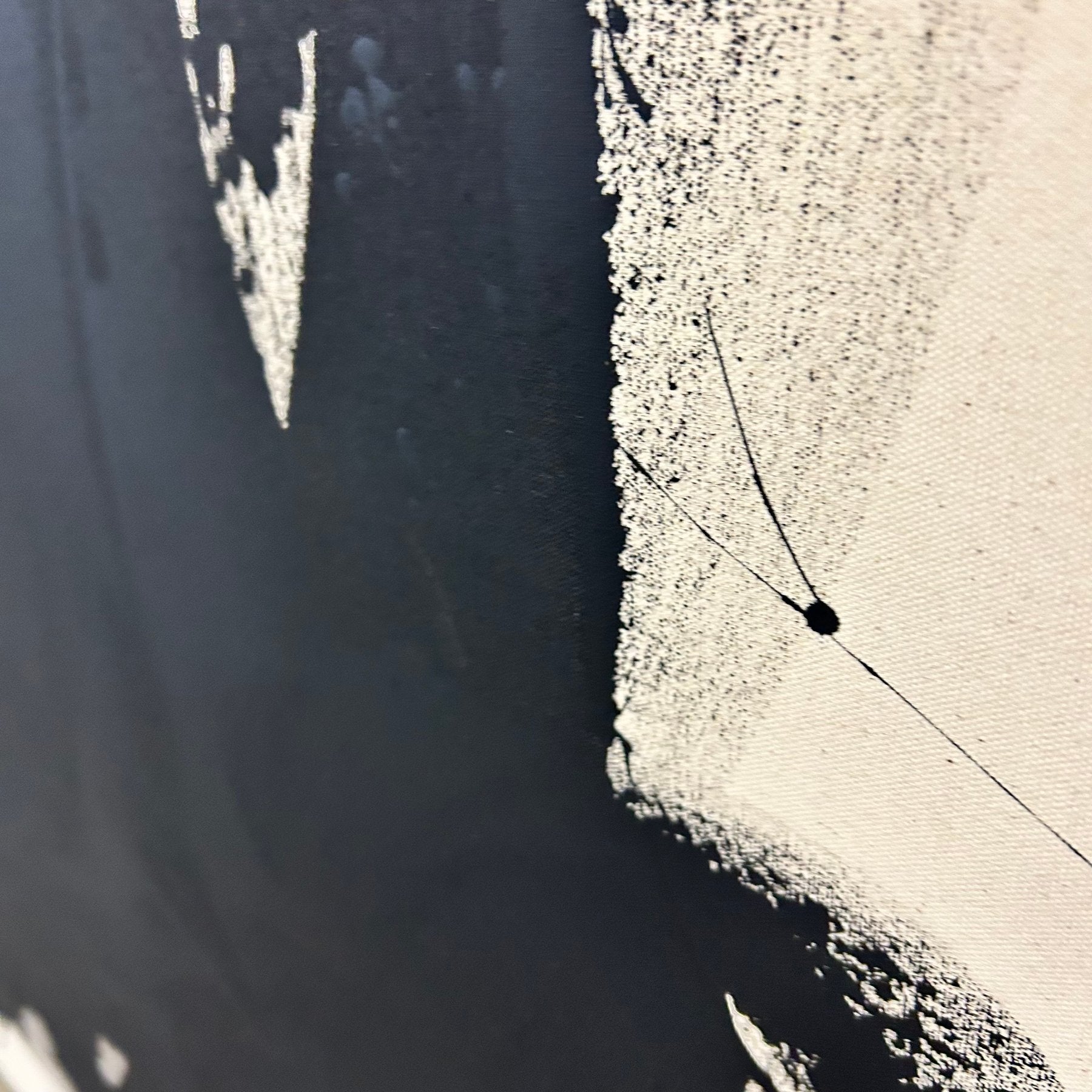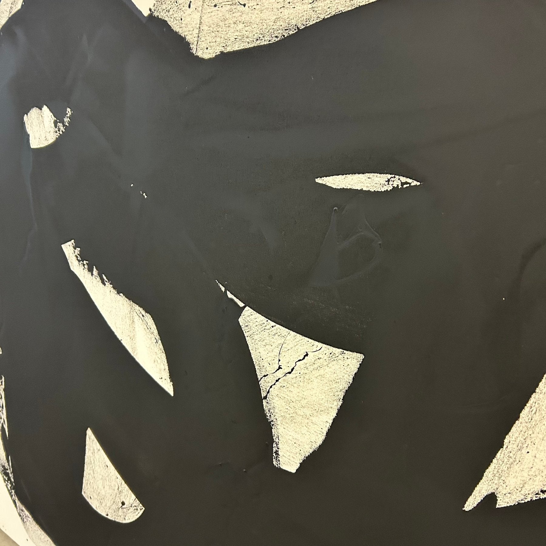 Les contours irréguliers et les ouvertures blanches au cœur de la composition suggèrent un mouvement organique, presque calligraphique, où le noir se déploie comme une énergie brute. Les éclaboussures et traces périphériques rappellent l’instantanéité de l’acte créatif, où la spontanéité du geste s’impose sur toute recherche de perfection formelle.