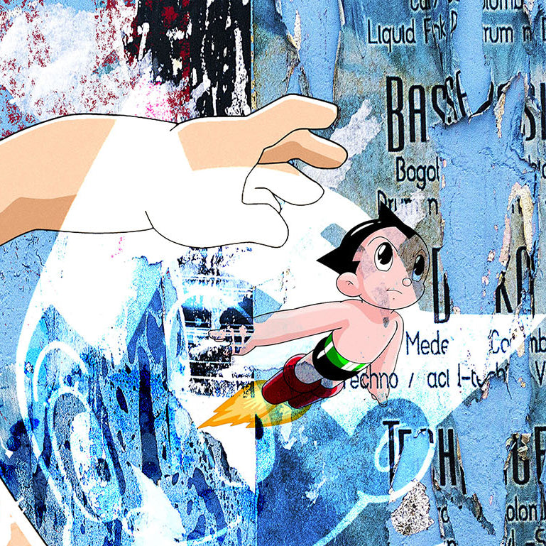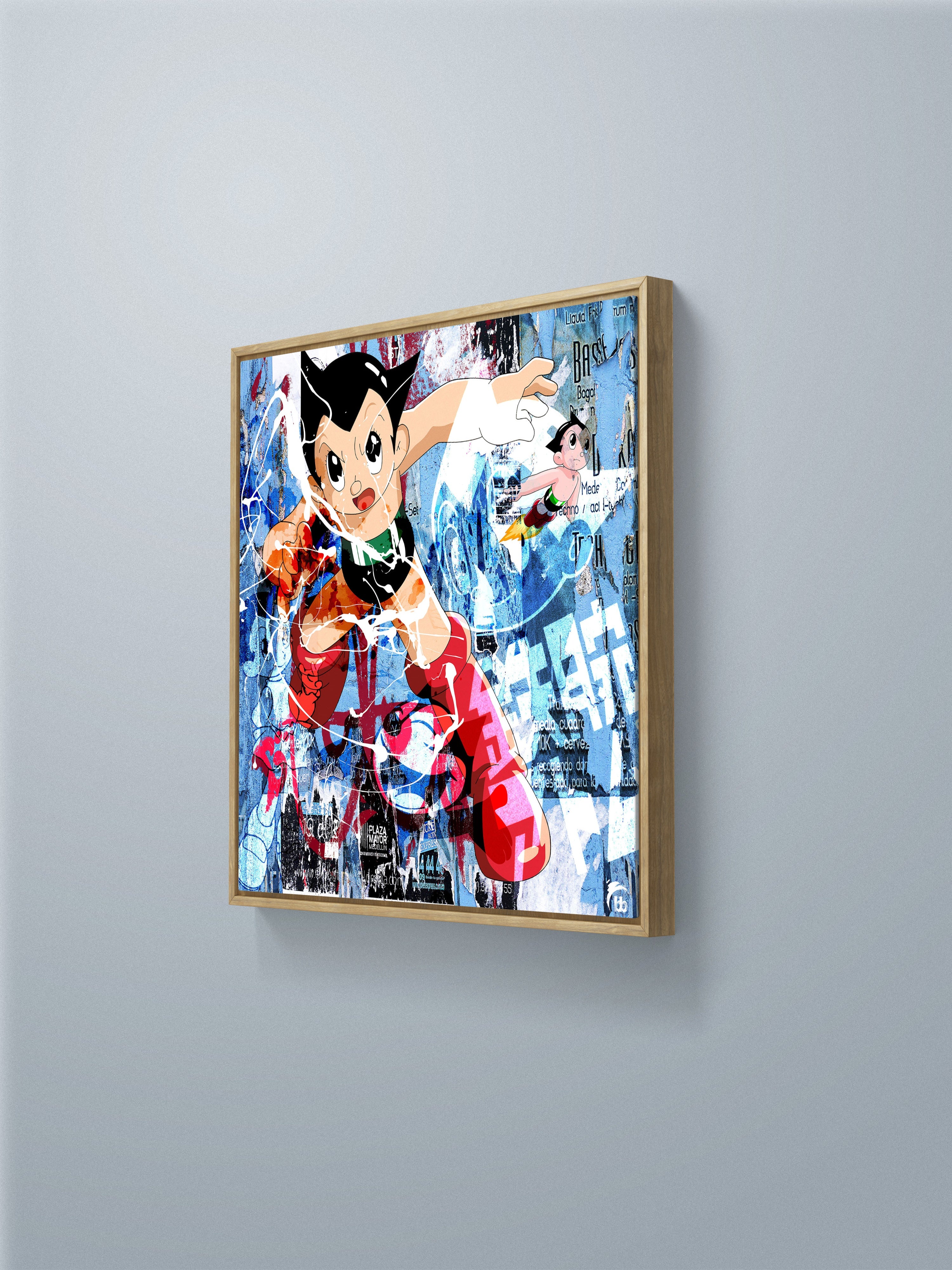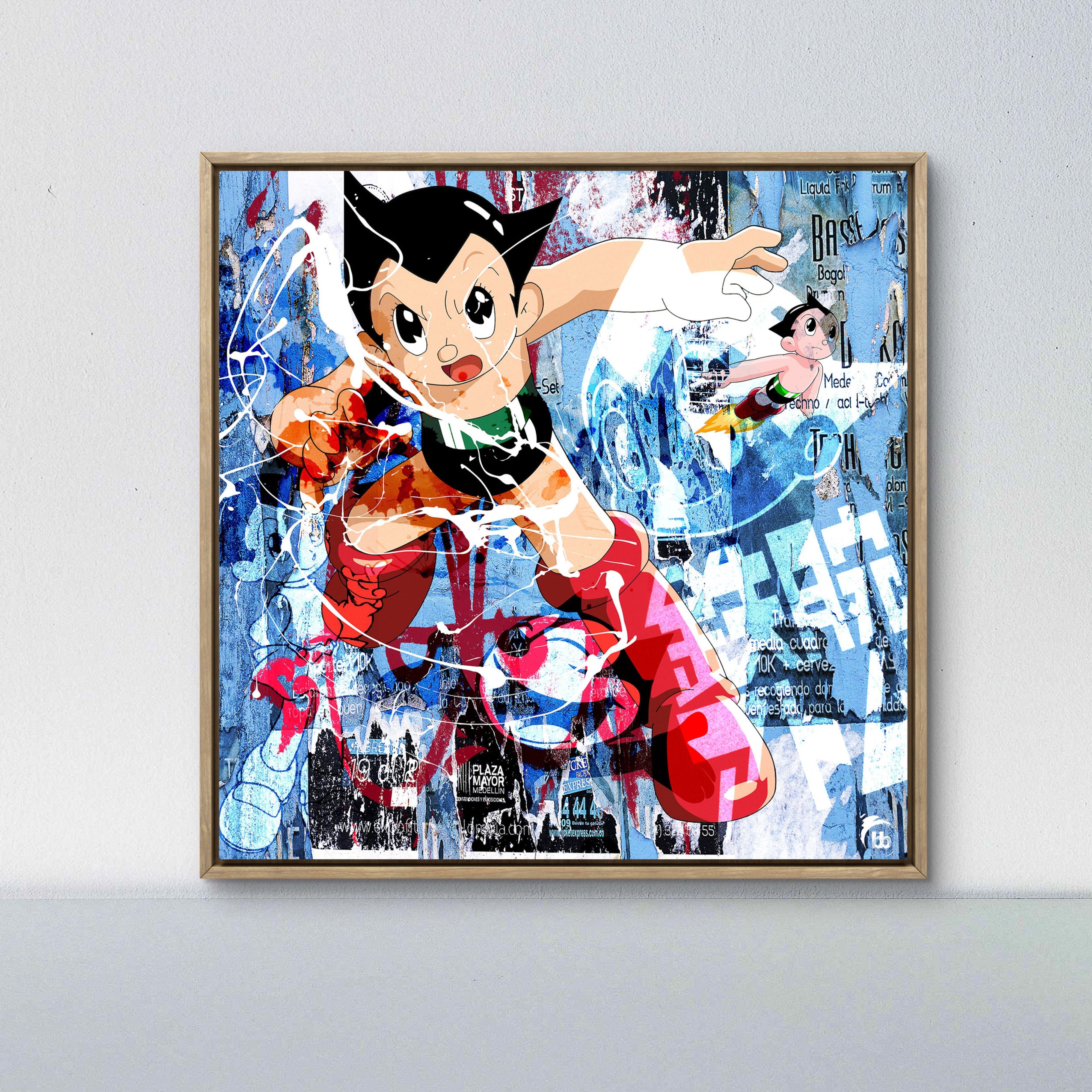 Dans cette œuvre énergique et colorée, Bruno Boffa rend hommage à Astro Boy, personnage iconique du manga et de l’animation japonaise. Le jeune héros surgit au premier plan dans une posture dynamique, comme prêt à bondir hors du cadre. Son univers futuriste s’entrelace avec un fond urbain texturé, composé d’affiches superposées, de graffitis, de typographies éclatées et d’éclaboussures de peinture blanche qui accentuent le mouvement et la vitalité de la scène.