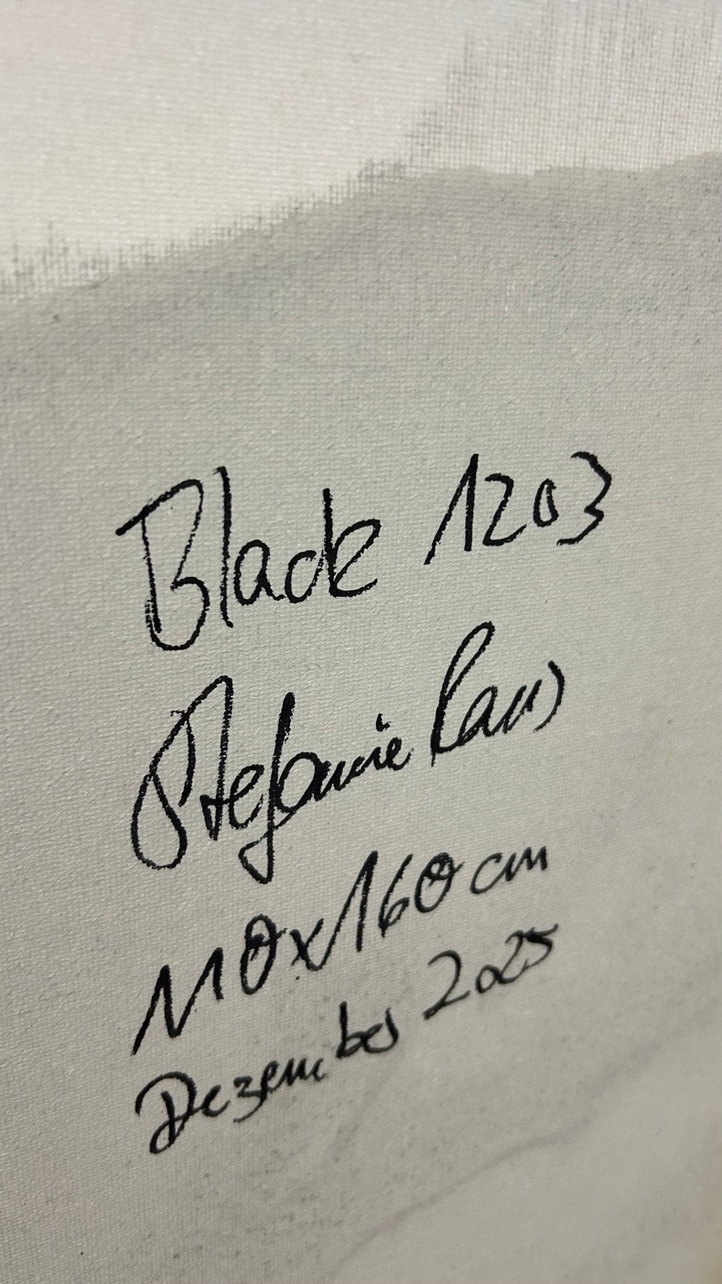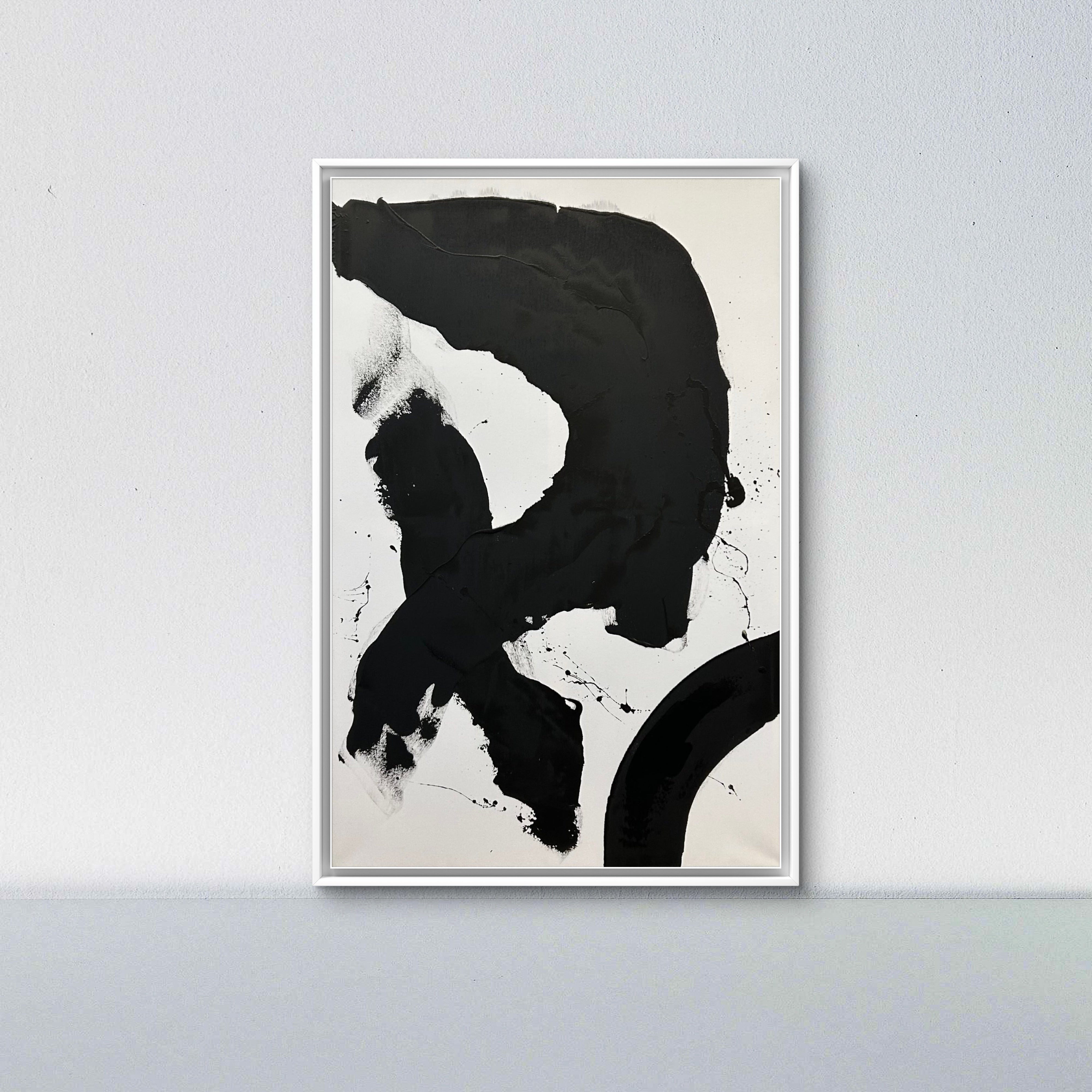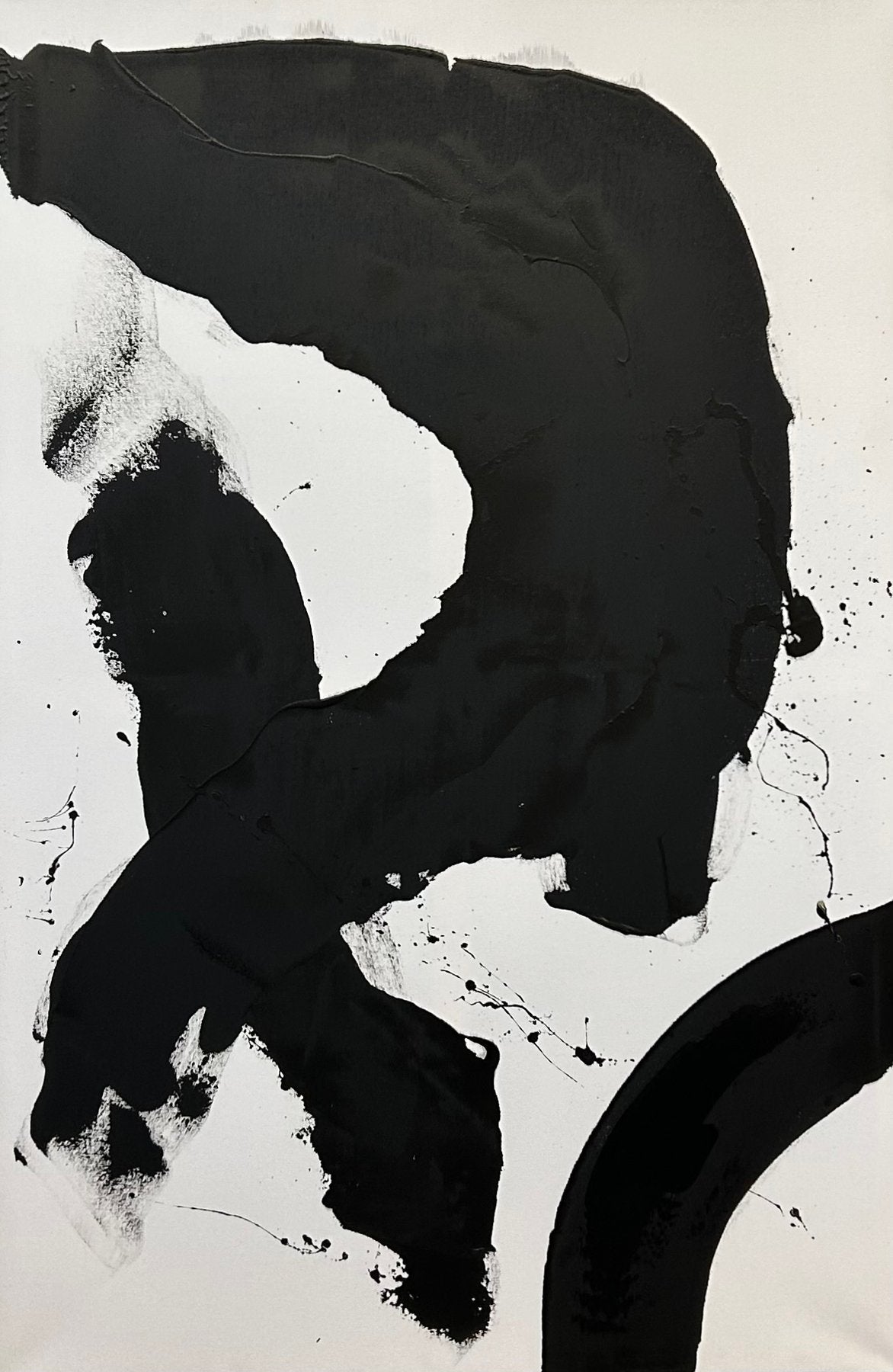 Cette toile de Stéfanie Raus présente une composition abstraite puissante en noir et blanc, dominée par de larges gestes picturaux fluides et contrastés. De profondes masses noires, appliquées en aplats denses et texturés, se déploient sur un fond clair, créant un jeu dynamique entre plein et vide, opacité et transparence.