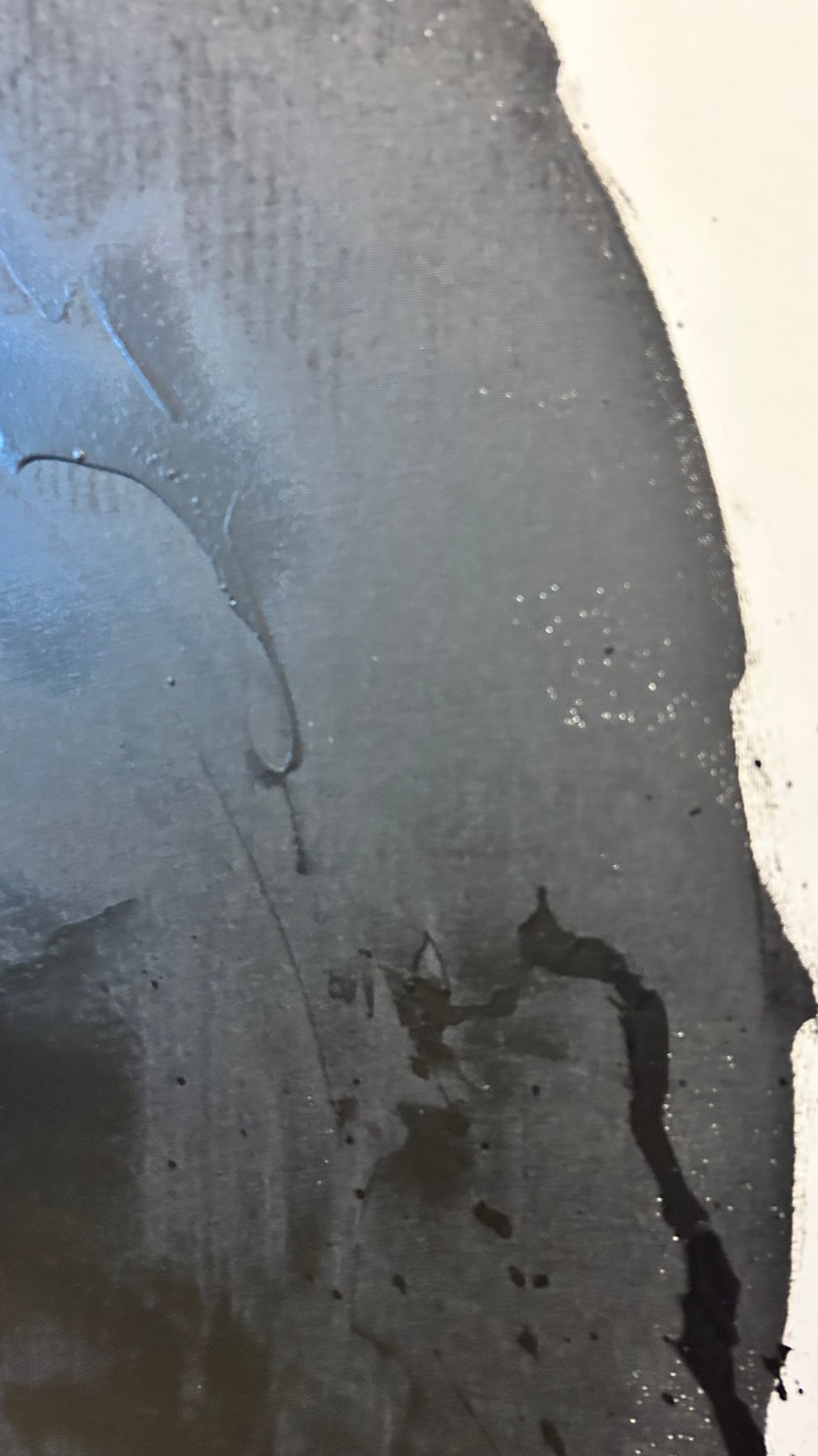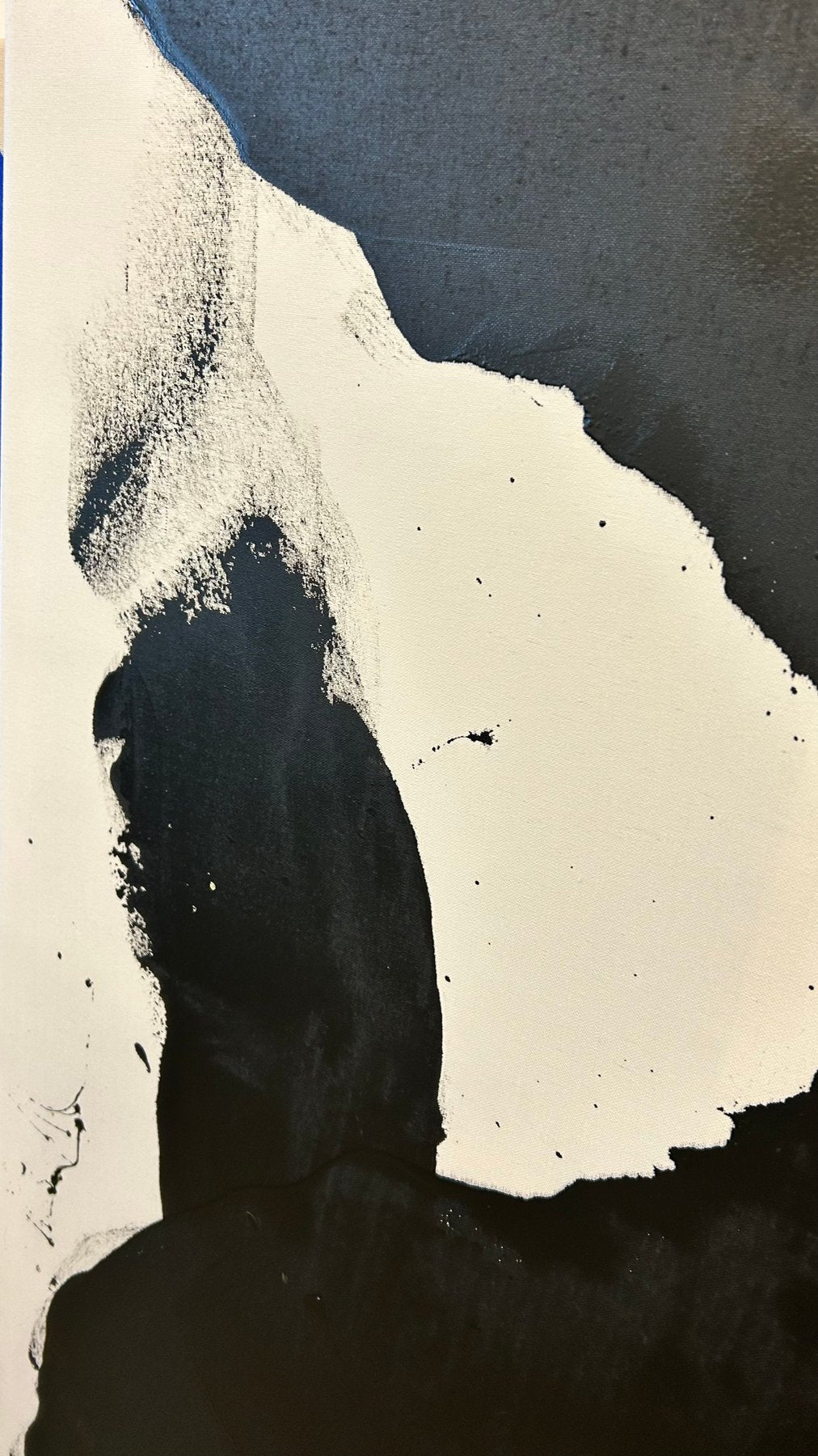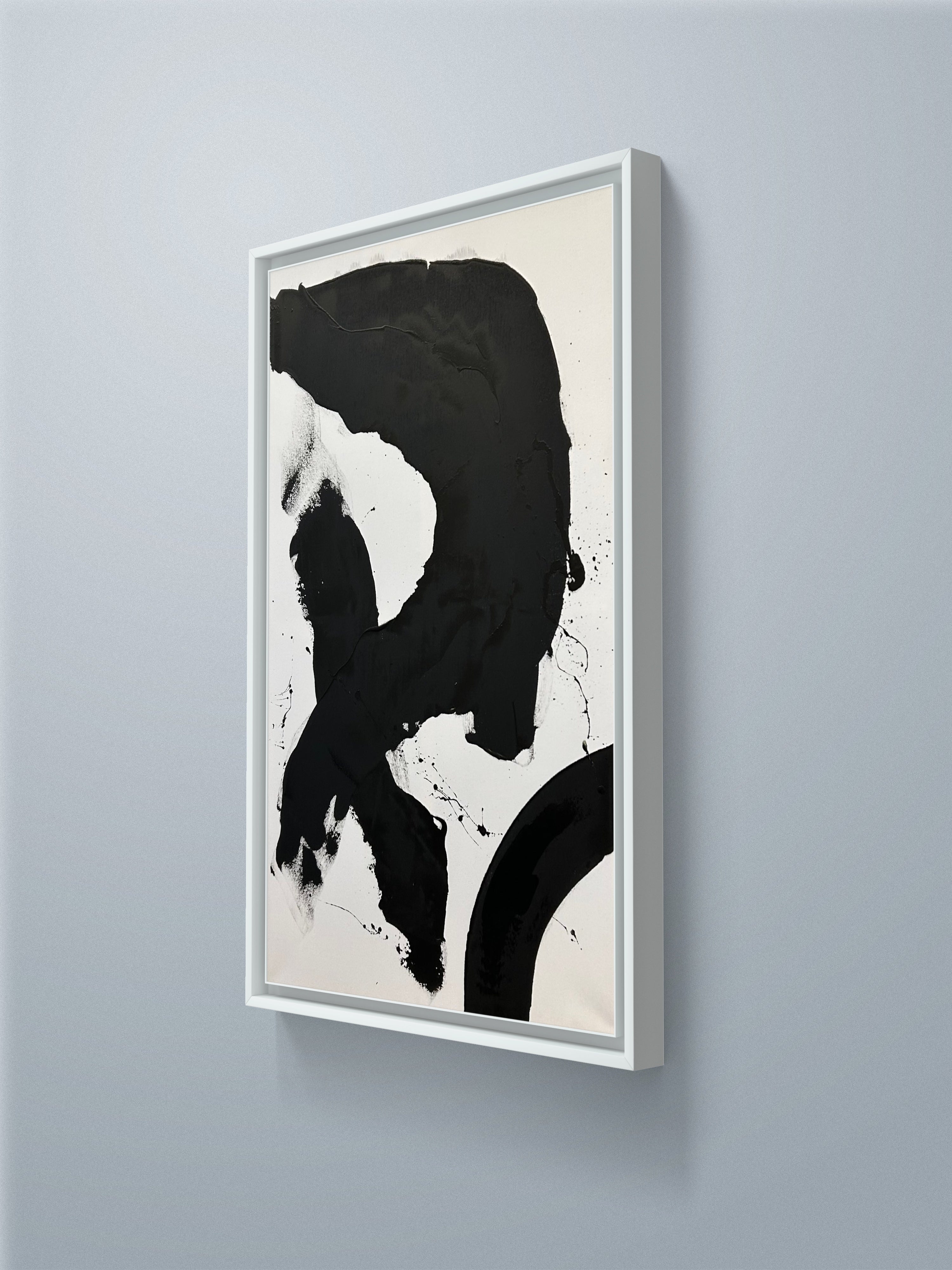 L’ensemble dégage une tension expressive forte, presque physique, où l’énergie du trait et la matière de la peinture deviennent le véritable sujet de l’œuvre. Par sa sobriété chromatique et la puissance de son contraste, la toile invite à une lecture intuitive et émotionnelle, laissant au regardeur la liberté d’y projeter ses propres images et sensations.