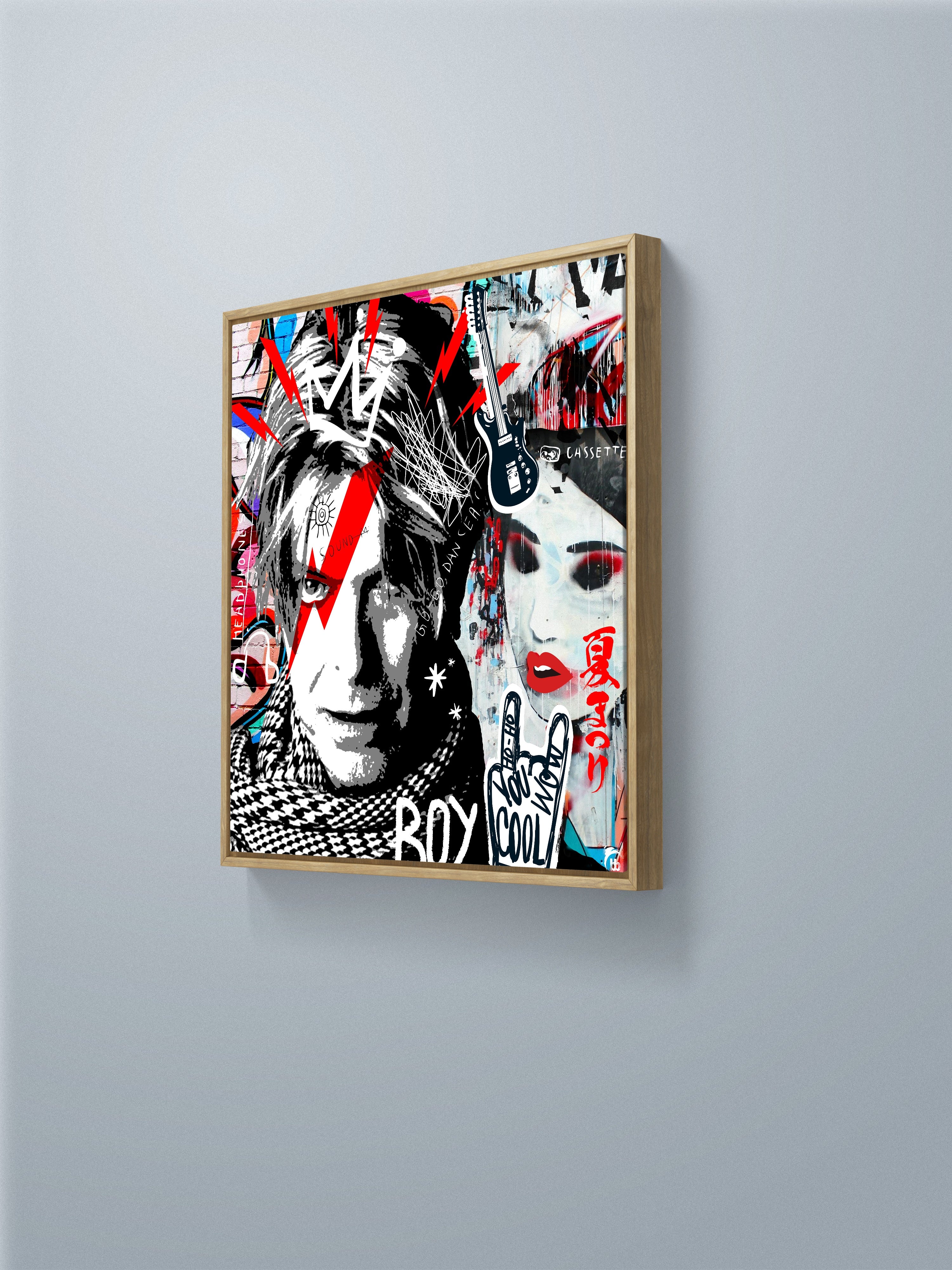 L’arrière-plan urbain, saturé de textures, d’affiches déchirées et d’éléments dessinés, évoque l’effervescence artistique et l’énergie contestataire qui ont accompagné Bowie tout au long de sa carrière. L’ensemble dégage une atmosphère électrique, à la croisée du rock, de la mode et de l’avant-garde.