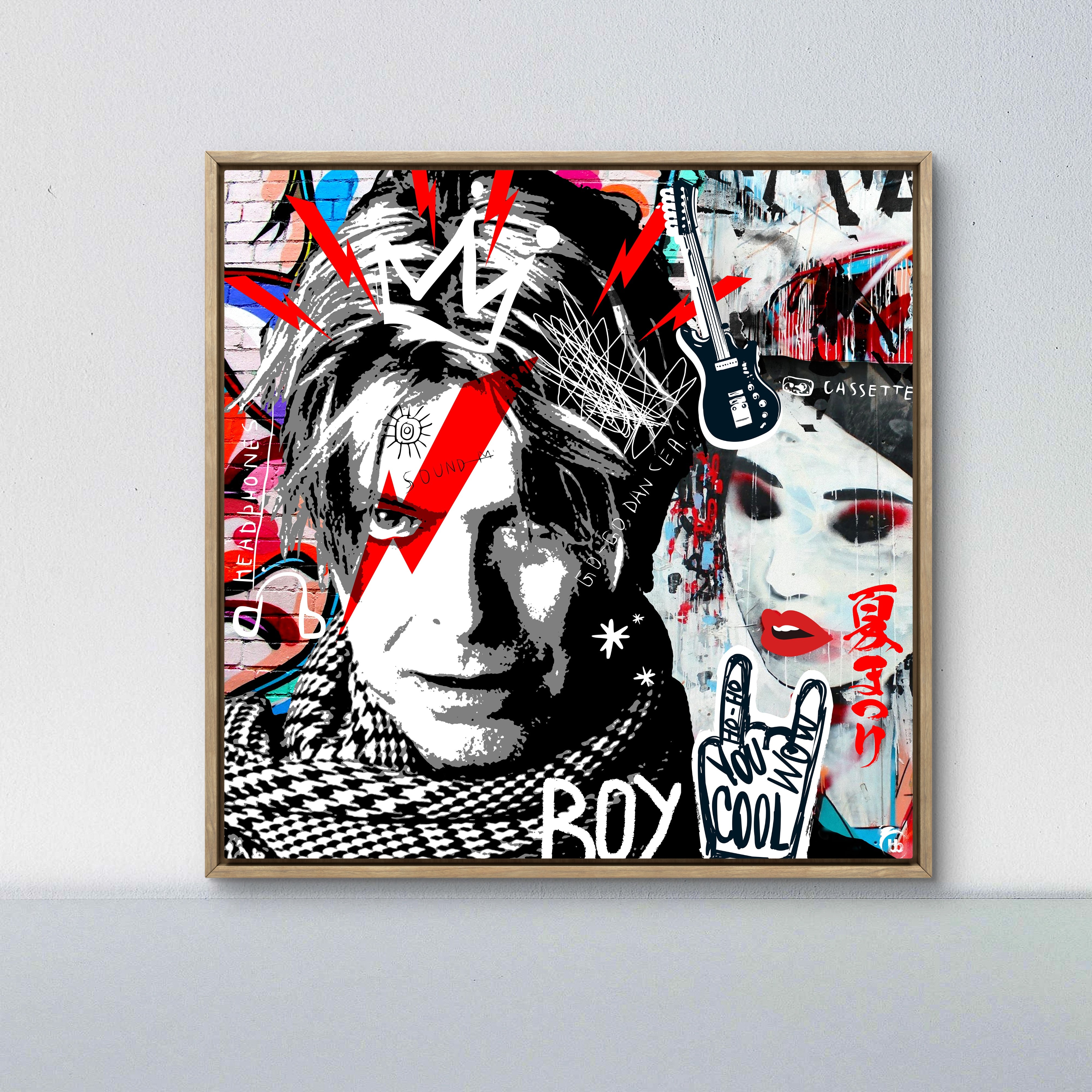Dans cette œuvre percutante, Bruno Boffa célèbre l’audace et le génie créatif de David Bowie, icône intemporelle de la musique et de la culture pop. Le portrait en noir et blanc de l’artiste, marqué par l’éclair rouge emblématique de Ziggy Stardust, occupe le centre de la composition. Autour de lui, un univers foisonnant mêle graffitis, symboles graphiques, éclairs rouges, guitares électriques, inscriptions manuscrites et références à la culture underground.