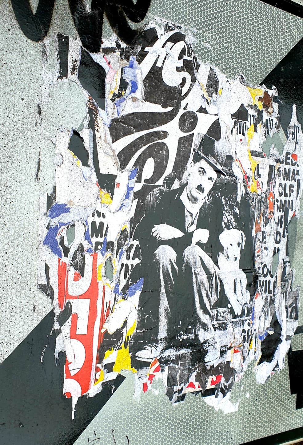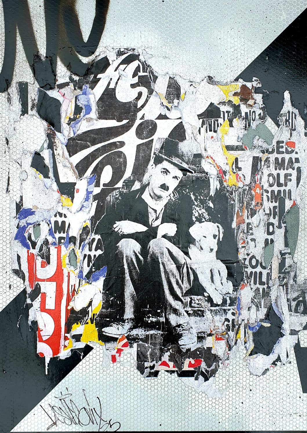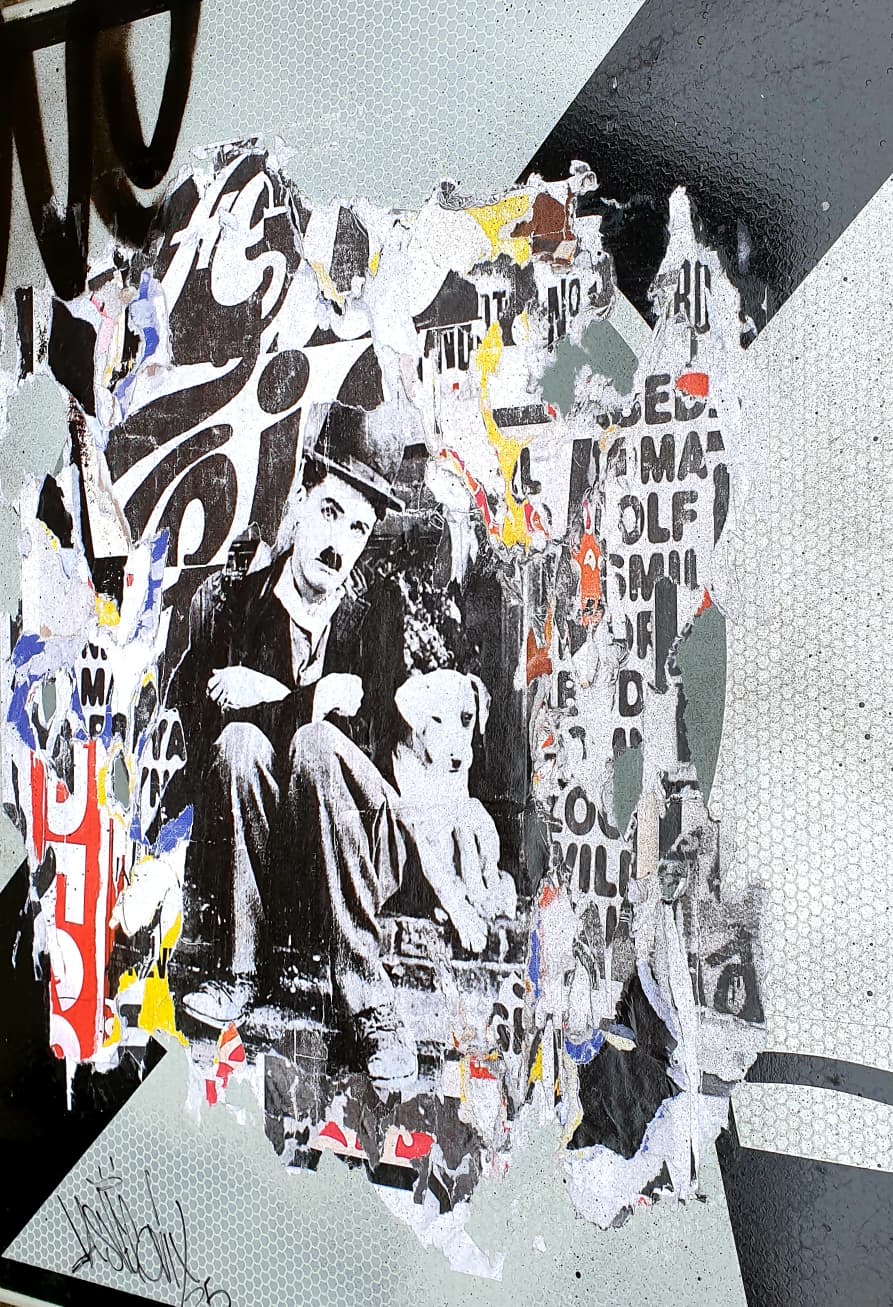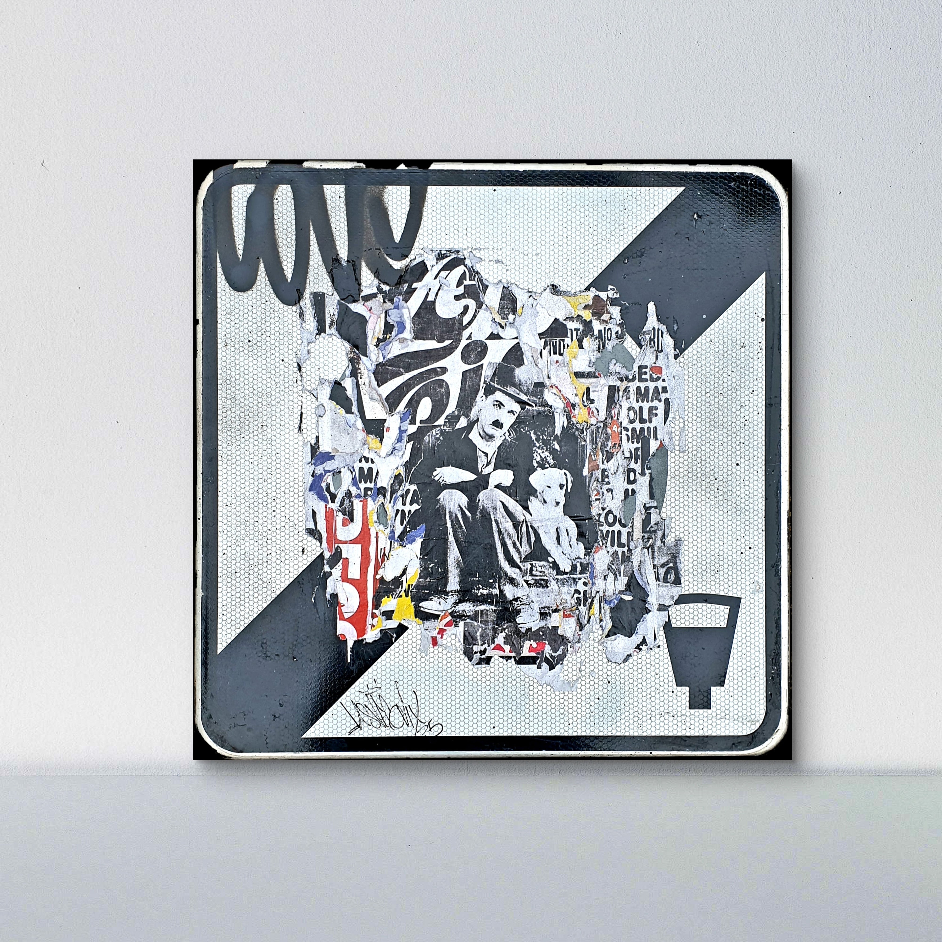 Dans cette œuvre singulière, Lasveguix détourne un véritable panneau de signalisation pour en faire un support artistique chargé de sens et de contrastes. Au cœur du panneau, un collage fragmenté laisse apparaître une image iconique de Charlot, le personnage légendaire incarné par Charlie Chaplin, assis avec un petit chien. Cette figure emblématique du cinéma muet surgit à travers des strates d’affiches déchirées, de typographies partiellement lisibles et de motifs urbains qui se chevauchent.