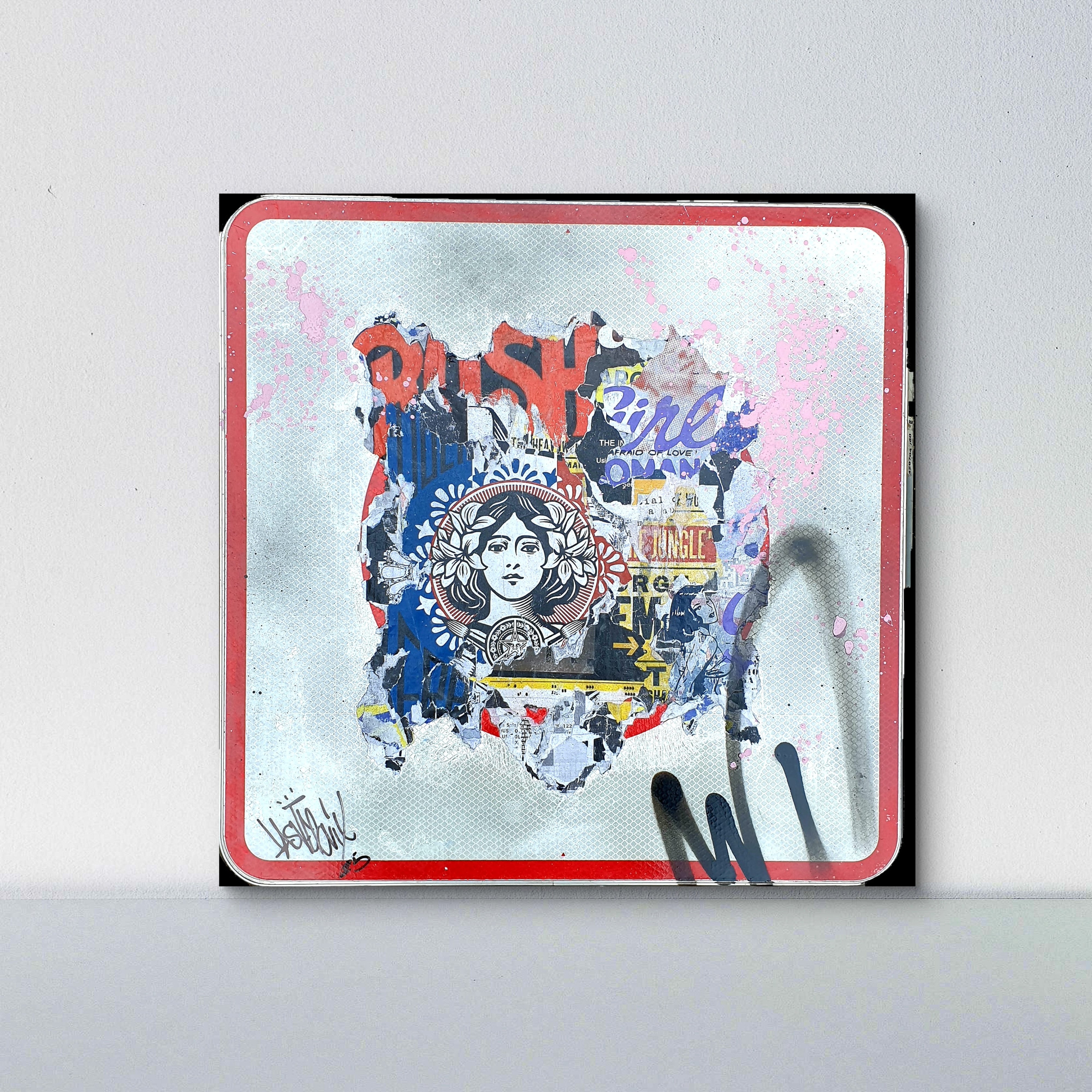 Le fond réfléchissant du panneau, partiellement visible sous les interventions artistiques, introduit un contraste fort entre la rigidité du code routier et l’énergie libre du street art. Les éclaboussures de peinture rose, les graffitis et la signature de l’artiste renforcent l’impression d’un objet arraché à l’espace public puis transformé en œuvre unique.