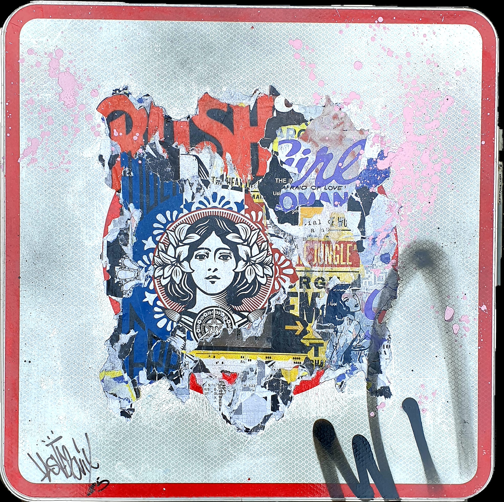 Sur ce véritable panneau de signalisation détourné, Lasveguix déploie l’une de ses signatures artistiques : un collage vibrant, saturé de fragments d’affiches, de typographies éclatées et de textures urbaines qui semblent arrachées aux murs de la ville. Au cœur de cette composition surgit la figure de Marianne, inspirée de l’esthétique d’Obey, symbole de liberté et d’engagement citoyen.