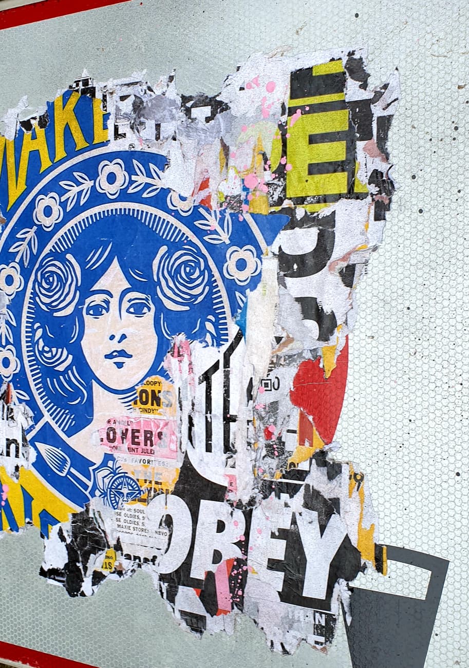 Sur ce panneau de signalisation authentique, Lasveguix présente une nouvelle variation autour de l’esthétique urbaine qui fait sa signature. Au centre, une figure féminine inspirée de l’iconographie d’Obey apparaît à travers un collage dense de fragments d’affiches, de typographies éclatées et de couleurs vives. Le bleu profond du portrait contraste avec les strates de papier déchiré qui l’entourent, évoquant le caractère éphémère et vivant des murs de la ville.