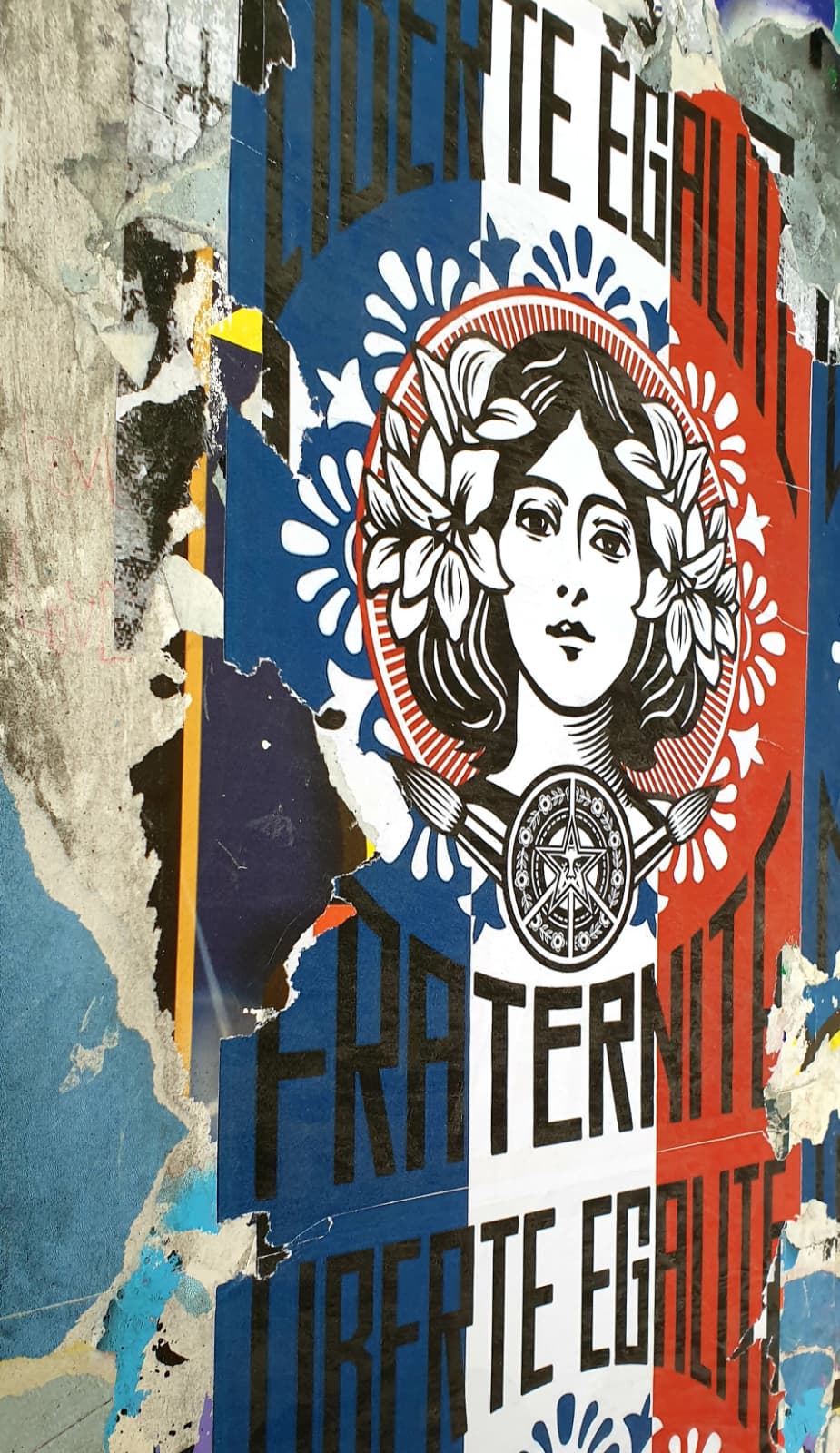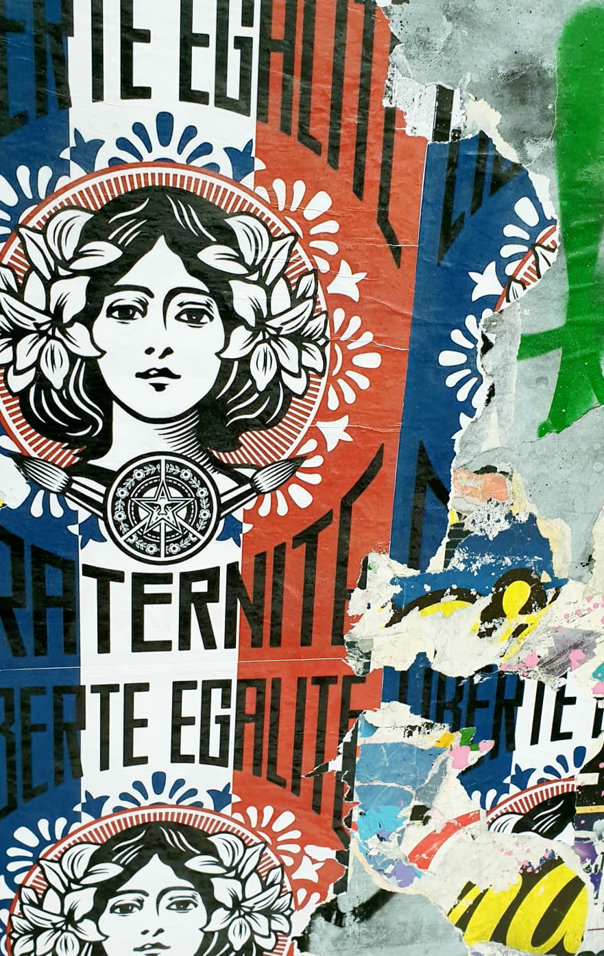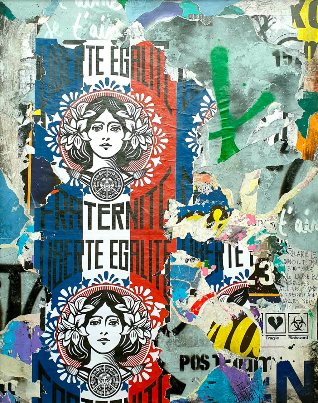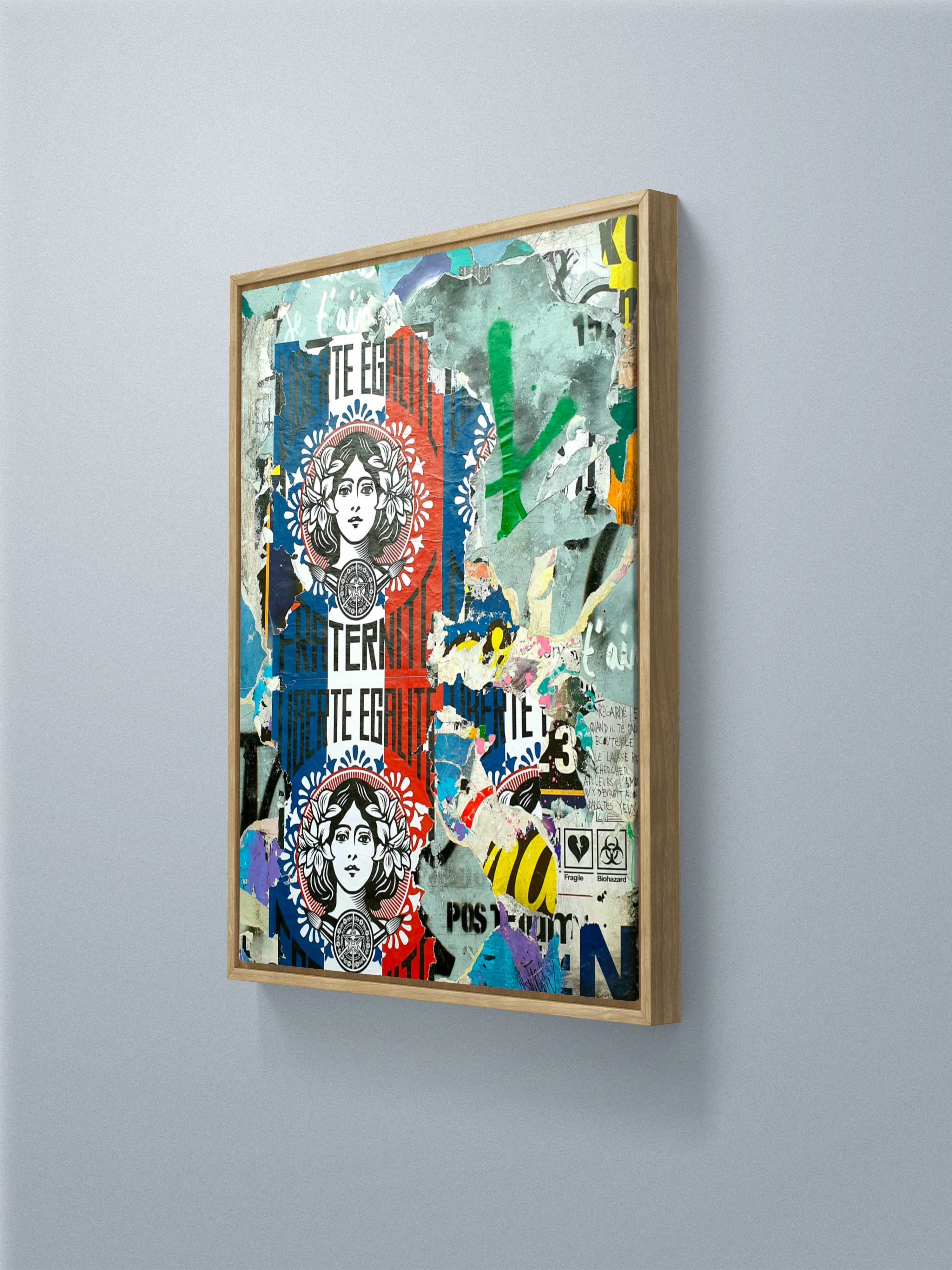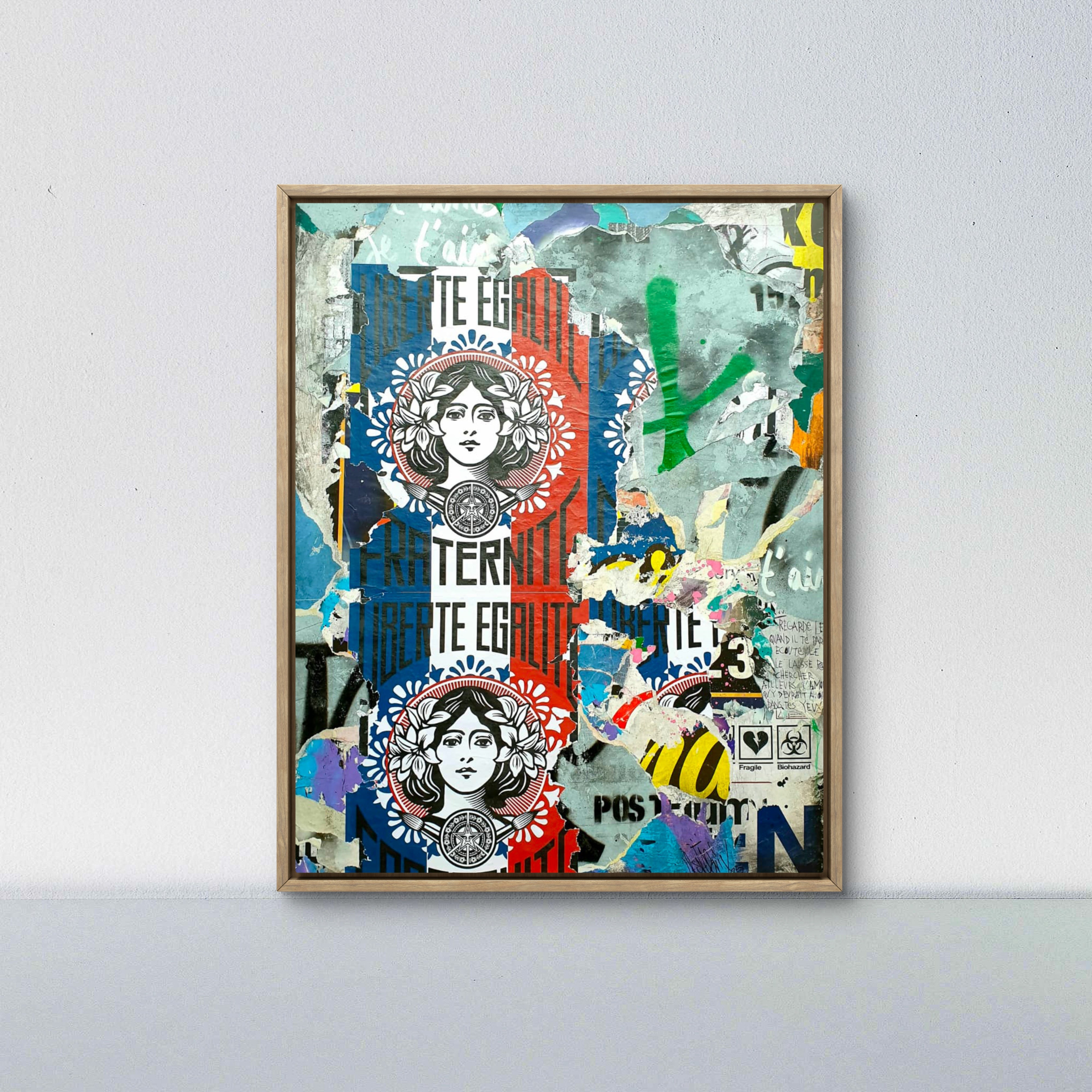 Marianne Obey Urban Wall est une œuvre urbaine vibrante signée Lasveguix, mêlant collage, superposition d’affiches déchirées et iconographie emblématique. Au centre de la composition apparaît la figure de Marianne, inspirée du style graphique d'Obey, entourée de motifs floraux et positionnée sur un fond tricolore bleu-blanc-rouge. L’inscription républicaine “Liberté, Égalité, Fraternité” traverse verticalement l’œuvre, renforçant la portée symbolique de la pièce.