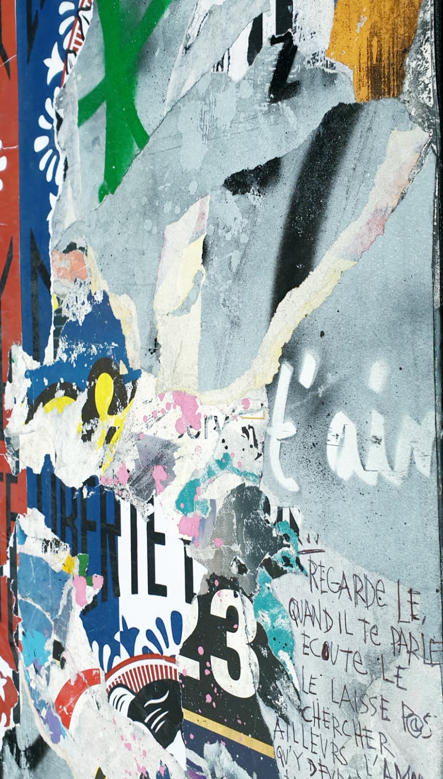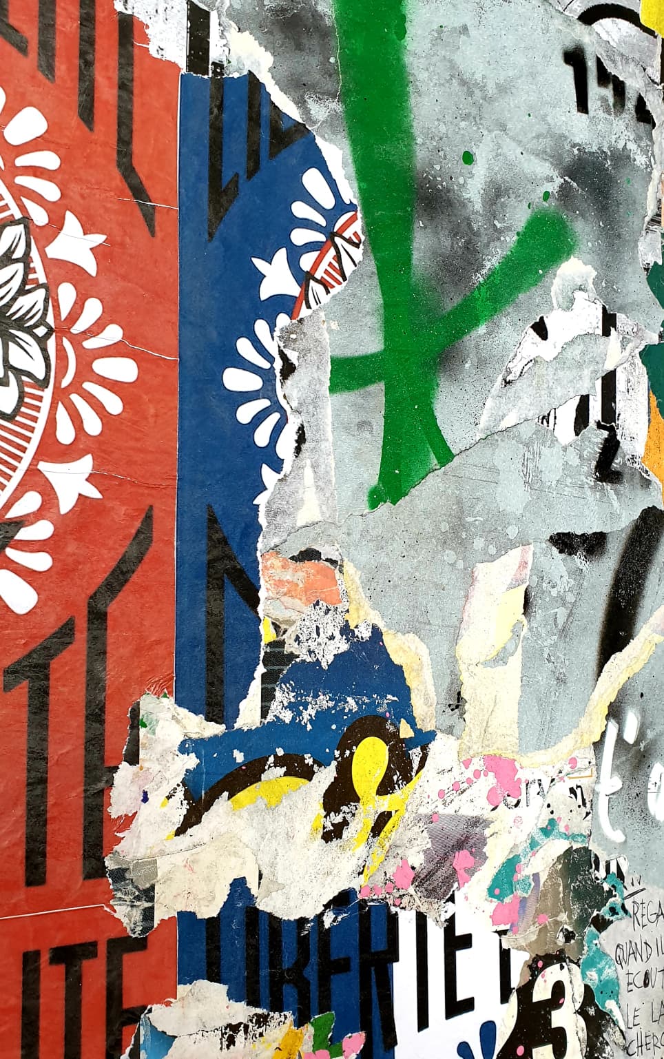 Autour de cette figure centrale, Lasveguix construit un mur vivant, fait d’affiches arrachées, de tags, d’éclats de couleurs et de textures irrégulières. Les couches successives révèlent un dialogue entre ordre et chaos, entre message officiel et expression populaire. Les fragments de typographies, les traces de peinture et les symboles graphiques confèrent à l’ensemble une esthétique brute, énergique et résolument street art.