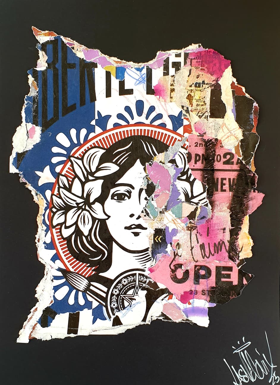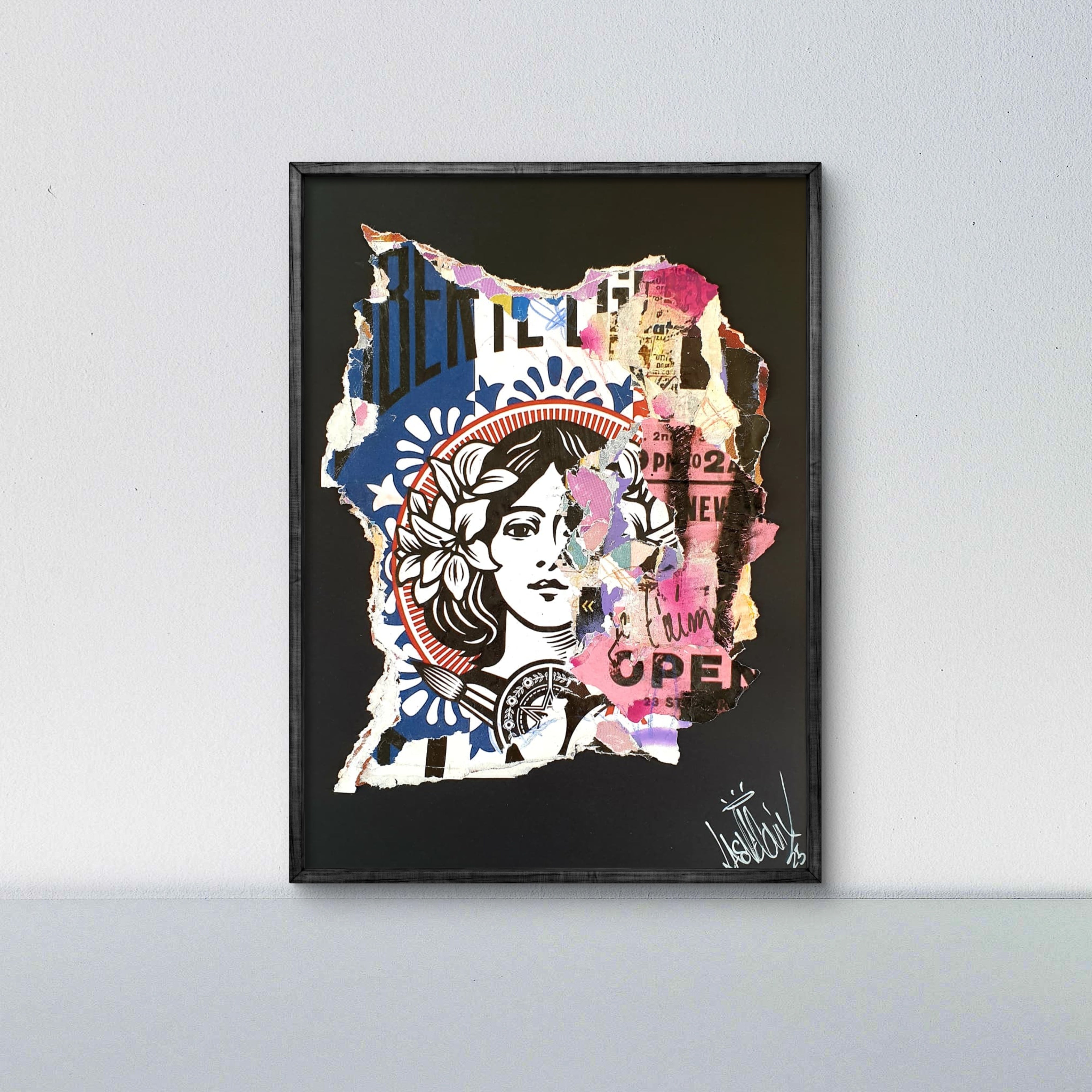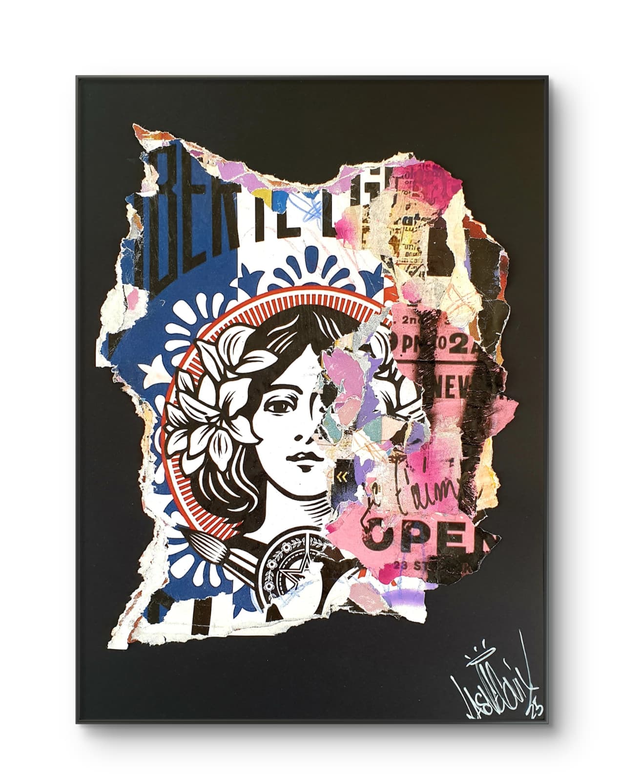 Dans cette œuvre, Lasveguix explore la technique du collage et de l’affiche déchirée pour revisiter une icône graphique bien connue : la Marianne popularisée par Shepard Fairey (Obey). Au centre, le visage stylisé et ornementé émerge à travers des strates d’affiches colorées, typographiques et manuscrites, créant un jeu de dévoilement progressif.