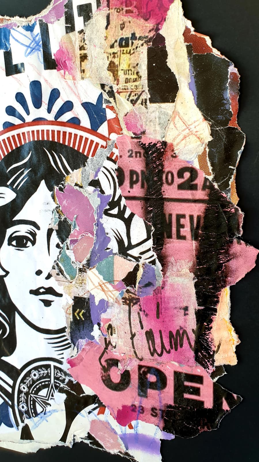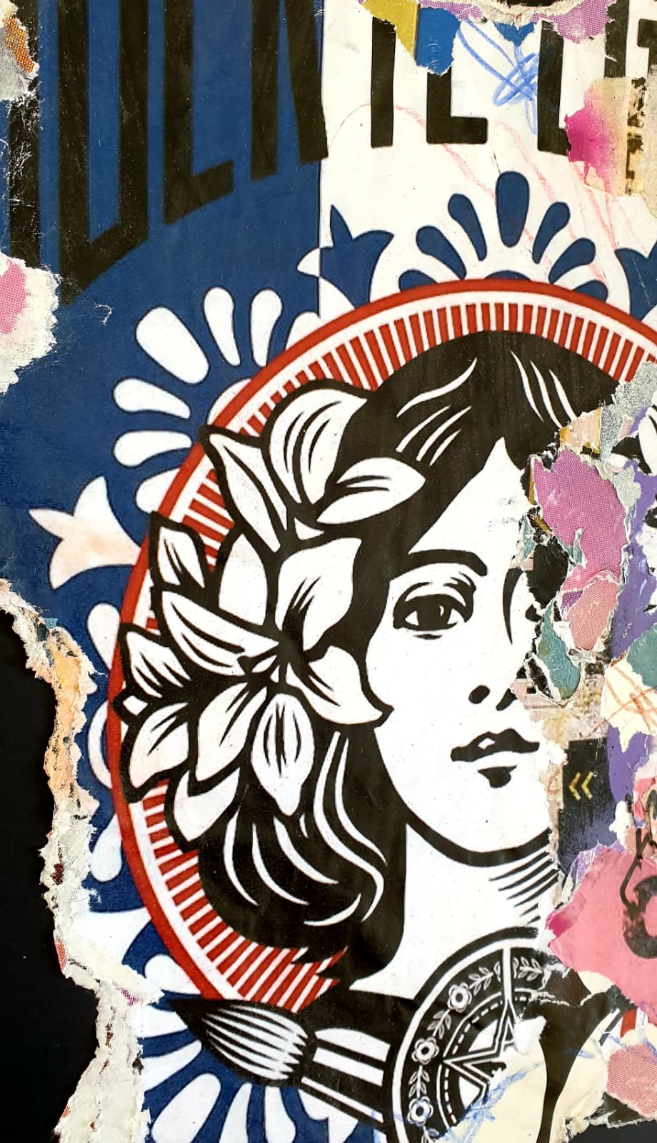 Les déchirures, les superpositions et les textures font écho à la matérialité de la rue, où les images s’effritent et se réinventent au fil du temps. L’œuvre interroge ainsi la tension entre icône et appropriation contemporaine, entre mémoire commune et expression personnelle.