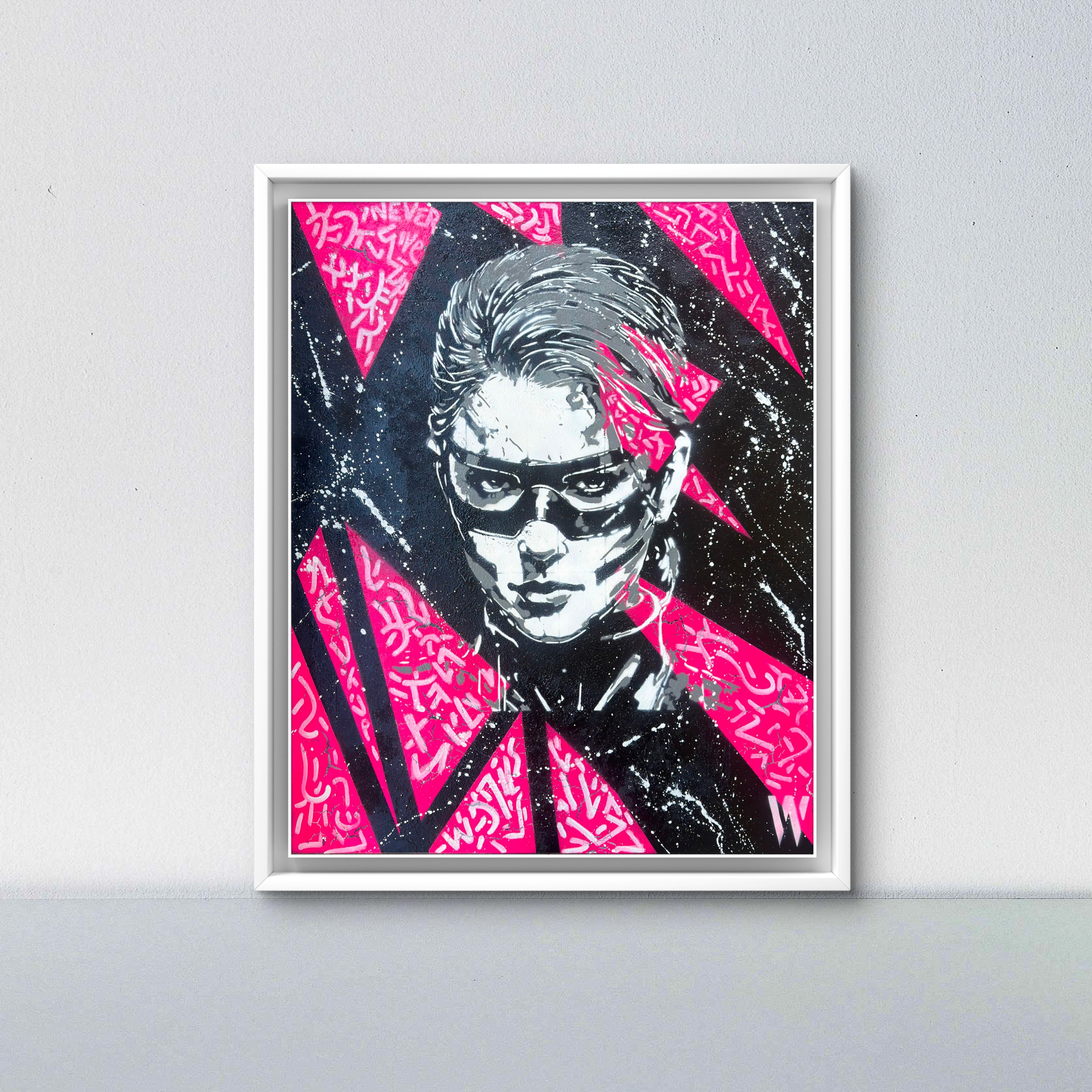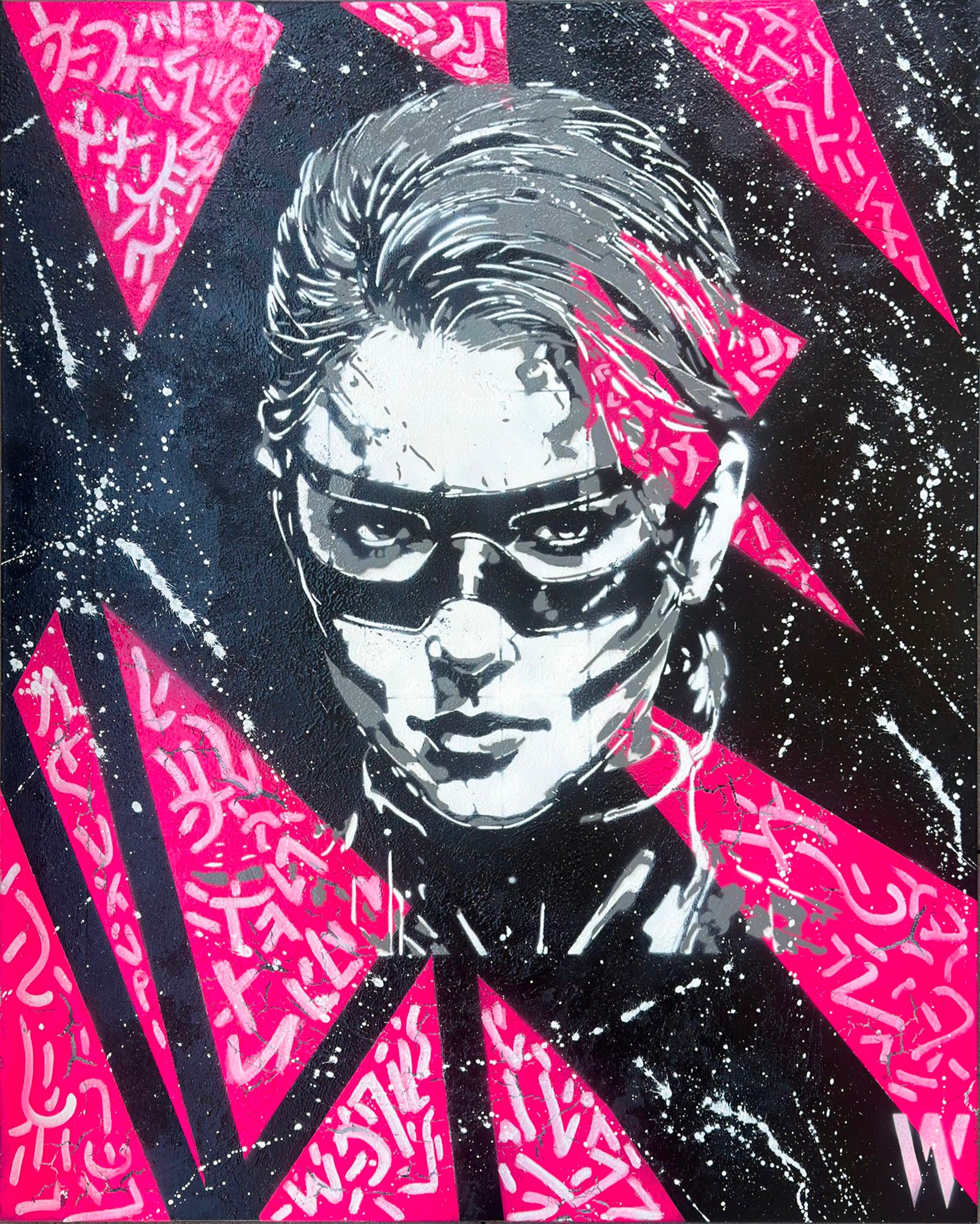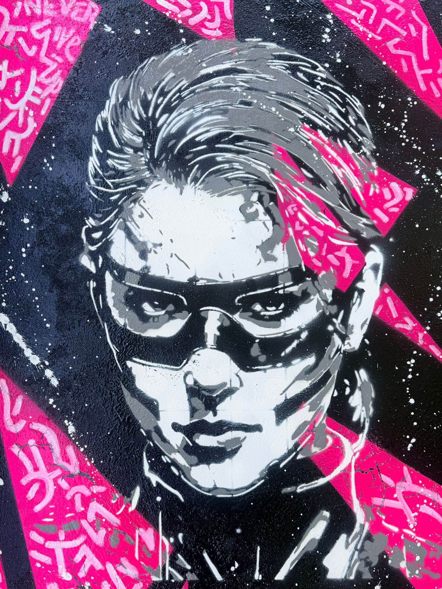 L’œuvre Trinity représente un portrait frontal stylisé, traité en noir, blanc et gris, sur un fond sombre éclaboussé de projections blanches rappelant un ciel étoilé ou une matière cosmique. Le visage, fermé et déterminé, est partiellement masqué par une sorte de visière ou de lunettes futuristes, renforçant une impression d’hybridation entre l’humain et la figure cybernétique.